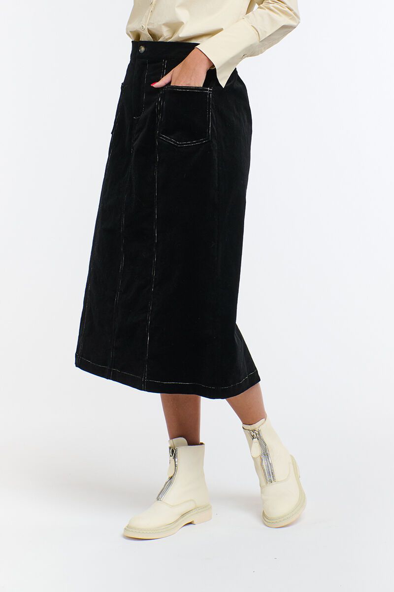 Soft corduroy and a flattering midi cut come together in this easy everyday skirt. The elastic waist adds comfort, while patch pockets keep things practical. Pair it with a chunky knit or blazer for that perfect smart-casual finish.