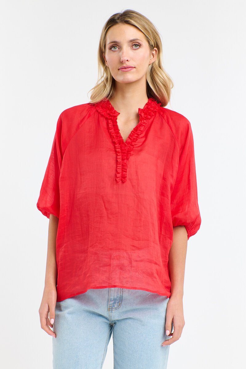 Light and airy with a touch of fun, this linen shirt brings an easy sense of movement to your outfit. The frilled neckline and relaxed fit add a feminine twist, while the raglan sleeves keep it breezy. Perfect tucked into denim or styled loose for laidback days.