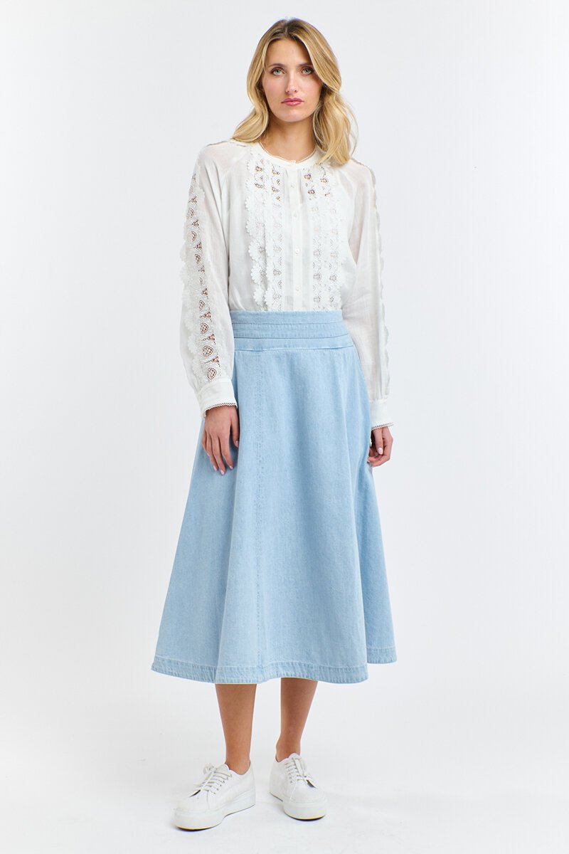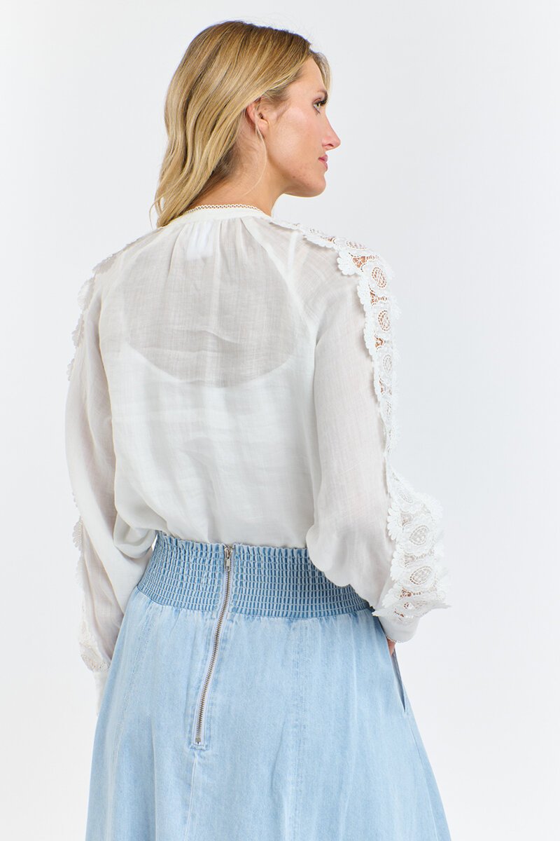 Delicate and feminine, the Romance Shirt is all about the details. Featuring soft lace panels, gentle gathering at the neckline, and buttoned cuffs for a polished finish, it’s a timeless piece that dresses up denim or pairs beautifully with tailored skirts and pants.