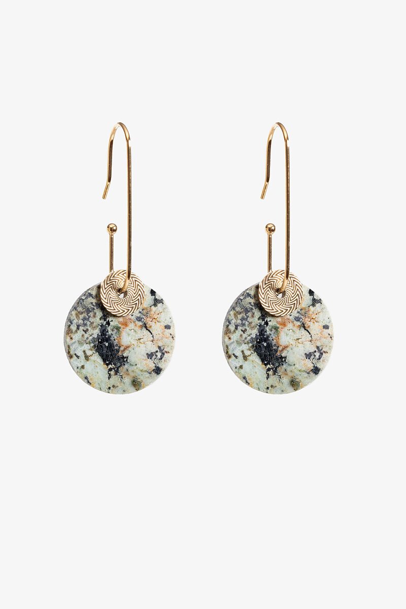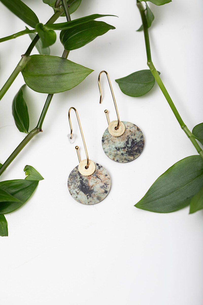 The Antler Sacred Dusk Earrings — earthy, elegant, and full of texture. Featuring natural stone discs with intricate gold detailing, they strike that perfect balance between relaxed and refined. The kind of piece that tells a story every time you wear it.