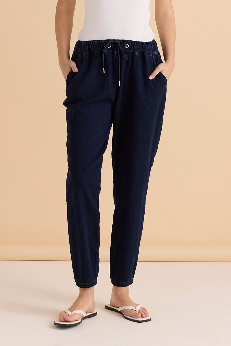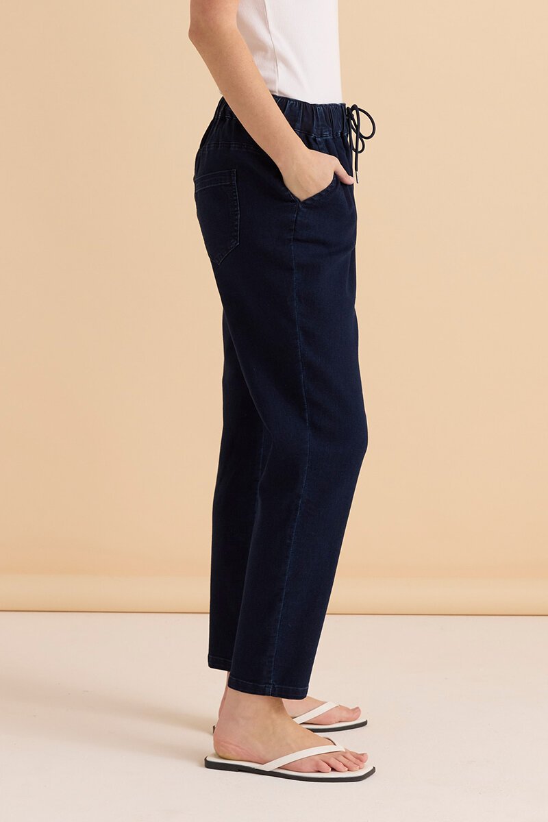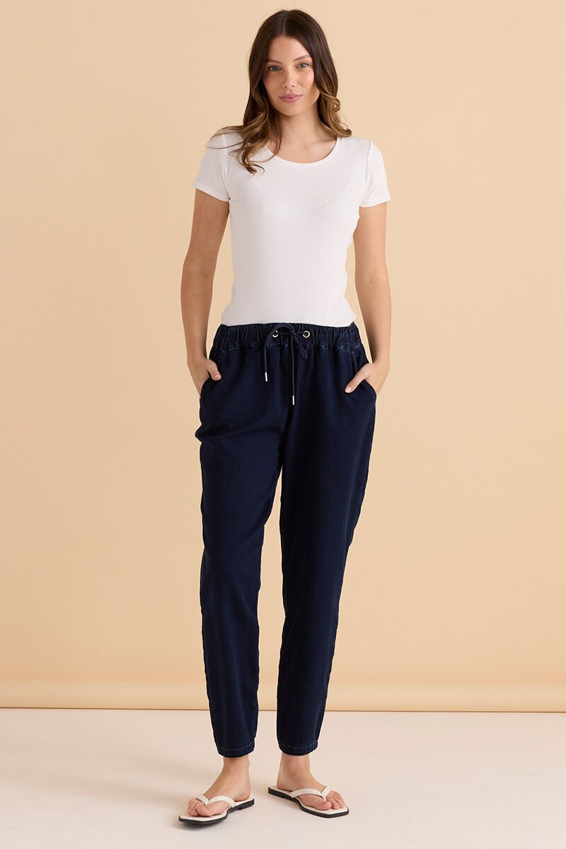 The Betty Basics Brooks Jean is relaxed and easy. Soft denim feel, elastic waist with drawcord, and a comfy tapered leg—made for everyday wear with tees, knits, or sneakers.