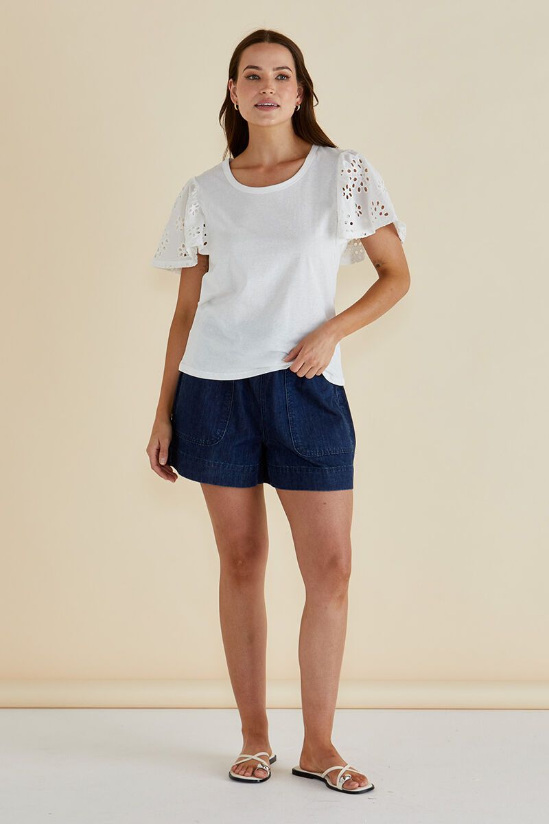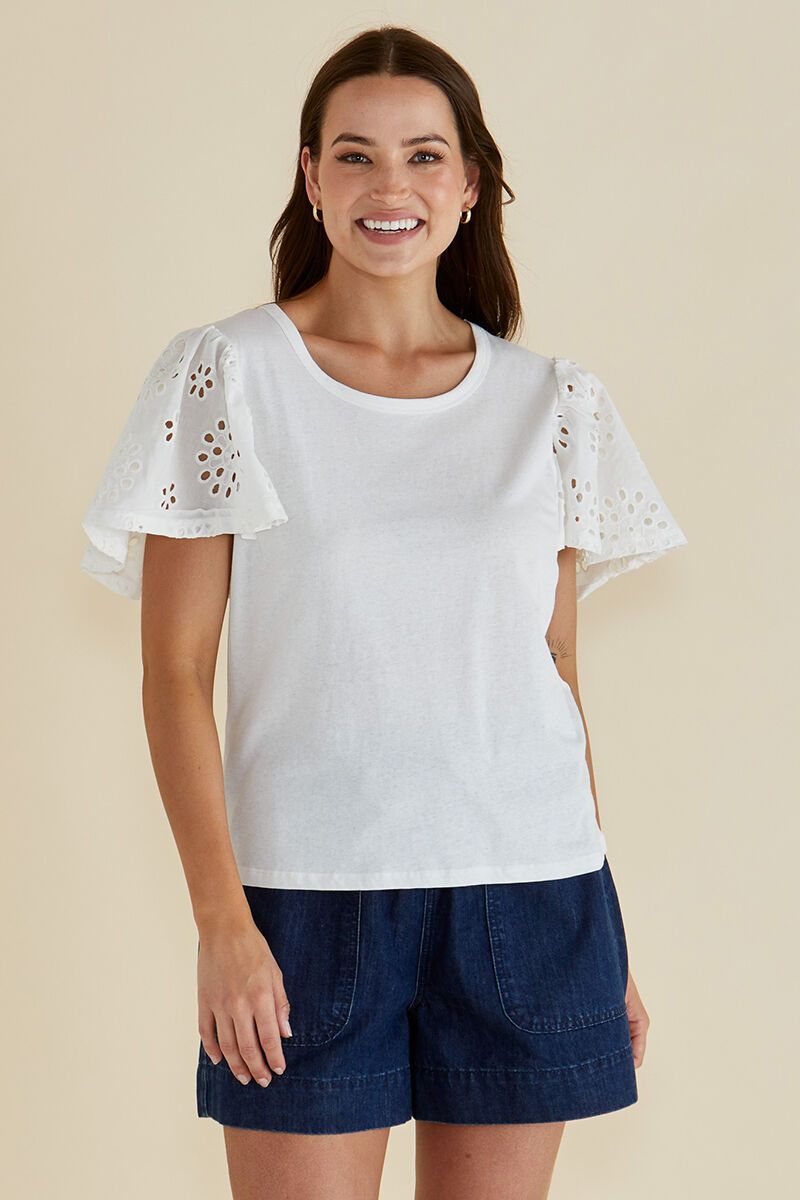 The Betty Basics Lottie Embroidered Tee brings a playful twist to your everyday look. With soft cotton comfort and Broderie anglaise flutter sleeves, it’s equal parts easy and elevated. Pair with shorts or denim for instant summer style.