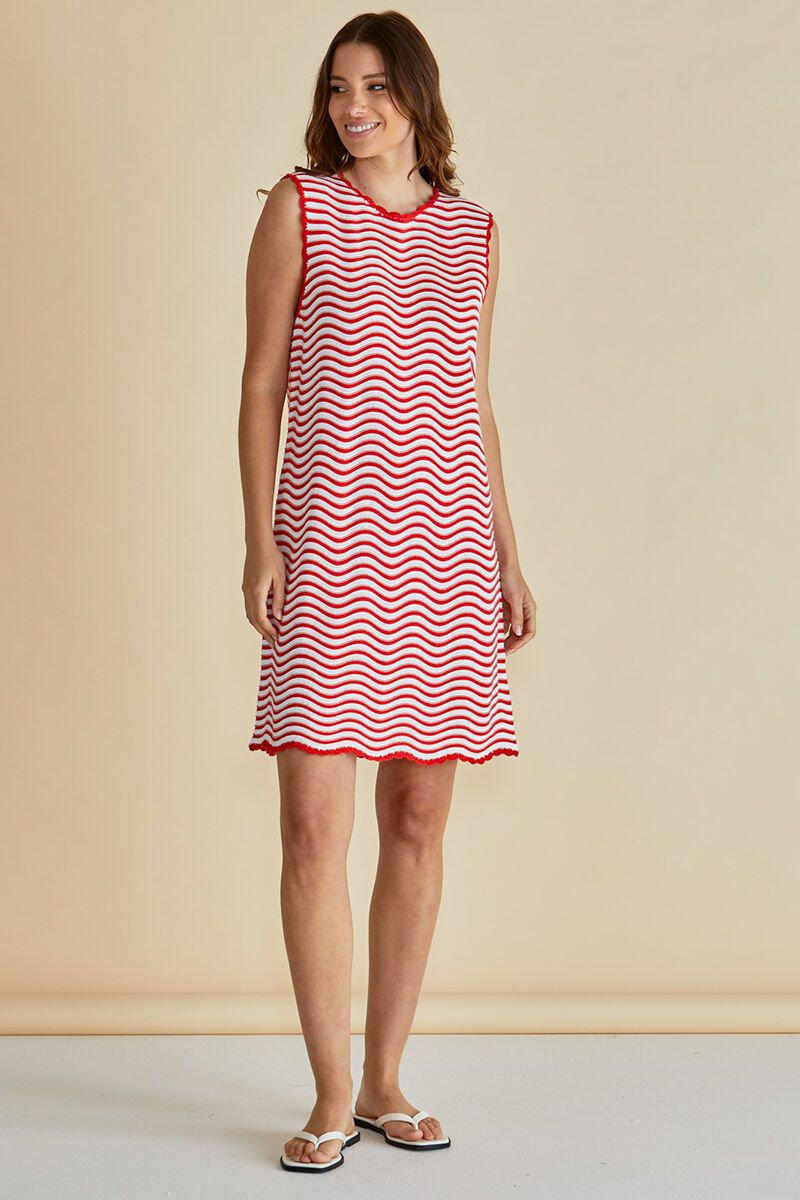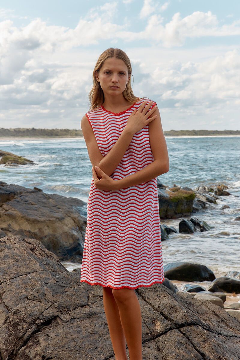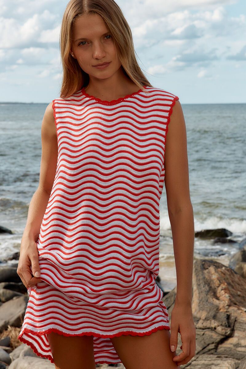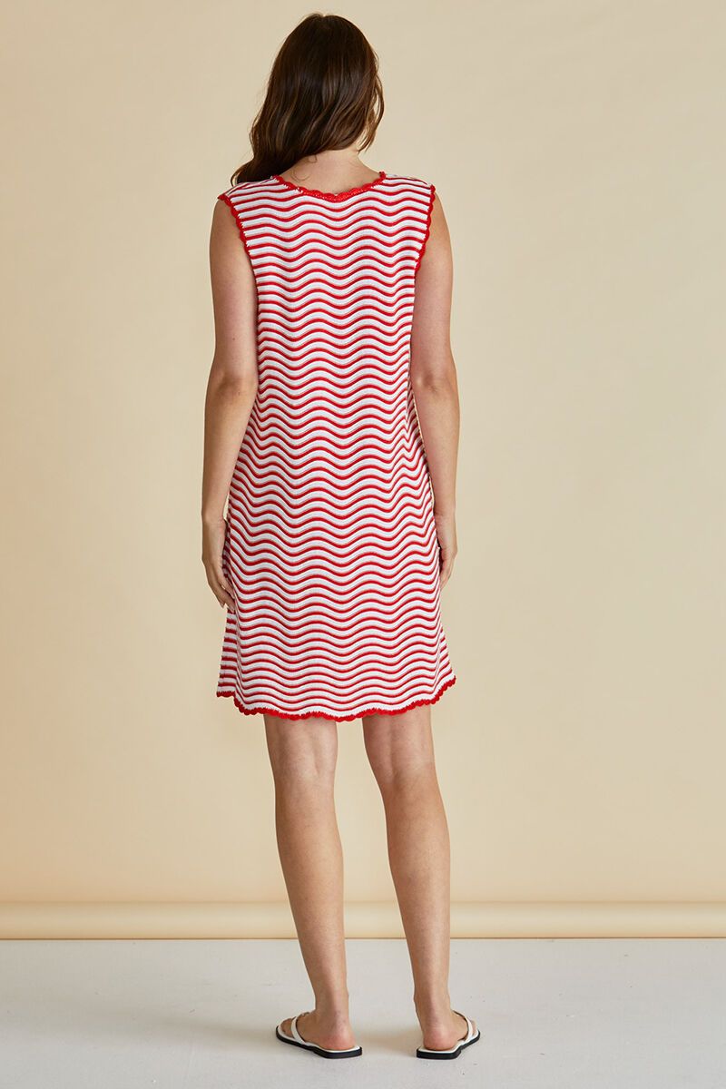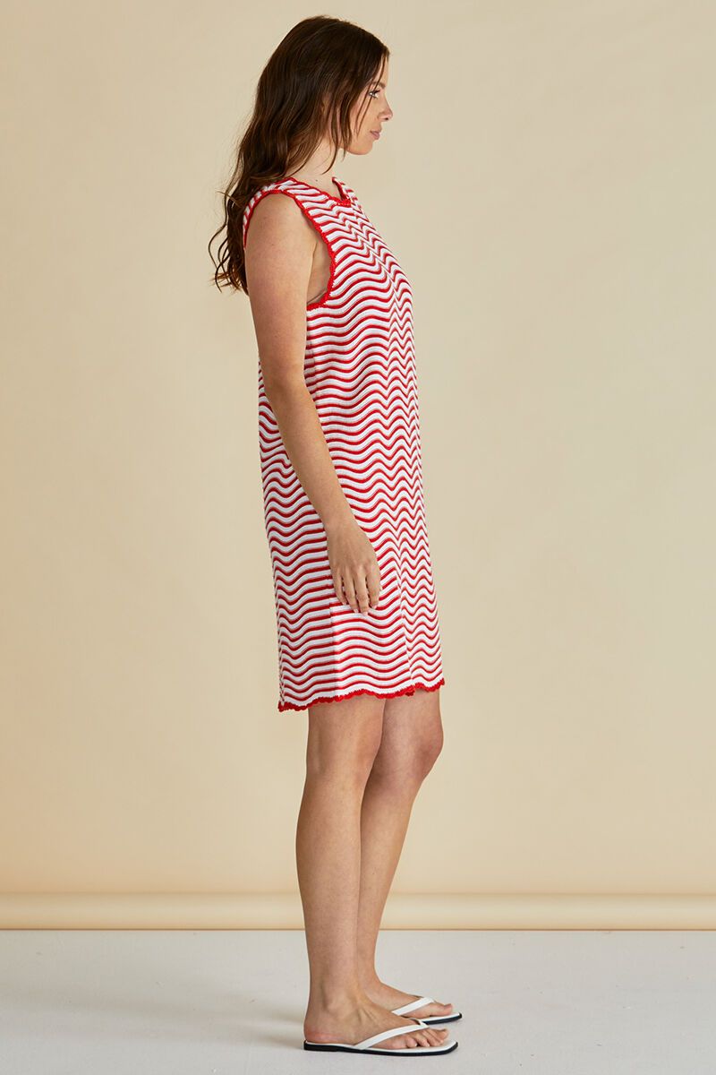 Fun, fresh, and full of personality, the Viola Tank sleeveless dress is made for sunny days. The textured wave knit, contrast trim, and slightly flippy hem give it throwback vibes in the best way. Easy to dress up or down—just add sandals and go