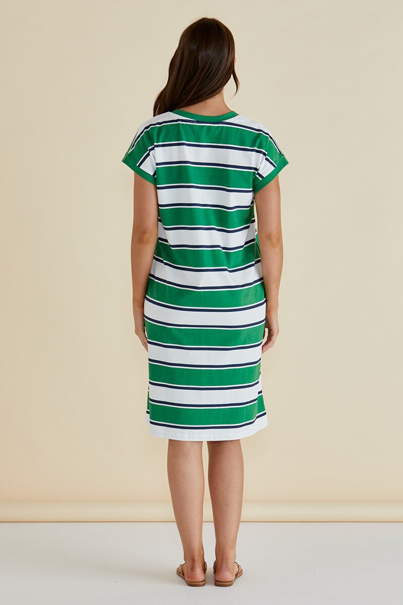 All over stripe in green, white and navyV-NecklineGrown on sleeve with cuffKnee LengthPocketsStretch jersey fabricRelaxed FitContent: 95% Cotton, 5% ElastaneCare: Machine washable according to instructions. Avoid post wash regrets - always check the labelMeasurements (refer to our WILL IT FIT ME tab below)1) Shoulder to front hem approx. 103cm - Size 122) Shoulder to back hem approx. 104cm3) Across bust approx. 55cmSamieka is 169cm tall and wears size 10.