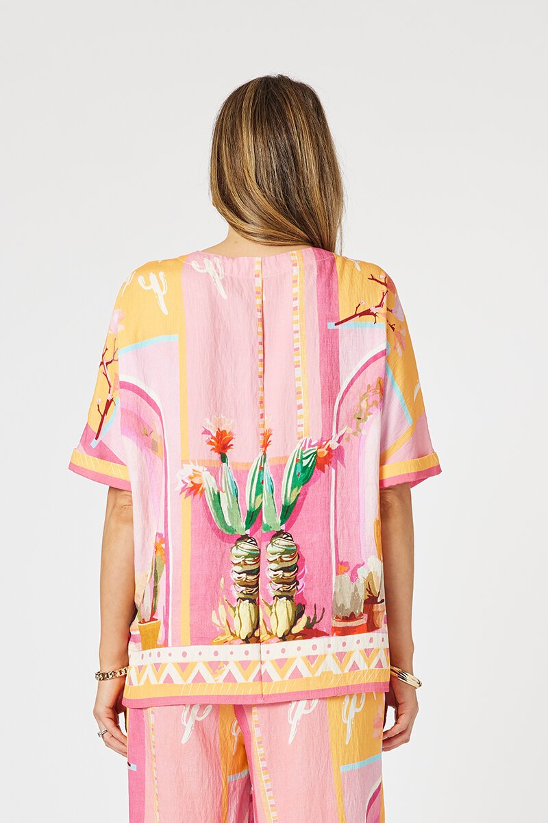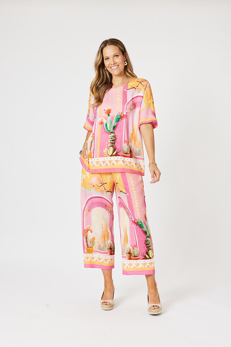 The Clarity Tulum Shell Top is your ticket to statement dressing. With its vibrant cactus print and relaxed, easy-fit silhouette, this top pairs perfectly with denim or the matching pant for a bold, head-turning look you’ll love to wear.