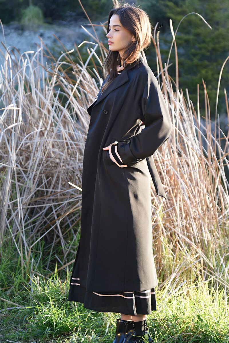 A modern take on a classic trench. The Trench Connection Coat features a fluid drape, double-breasted front and statement trim detail, finished with a self-tie belt for an effortlessly polished, wear-anywhere layer..