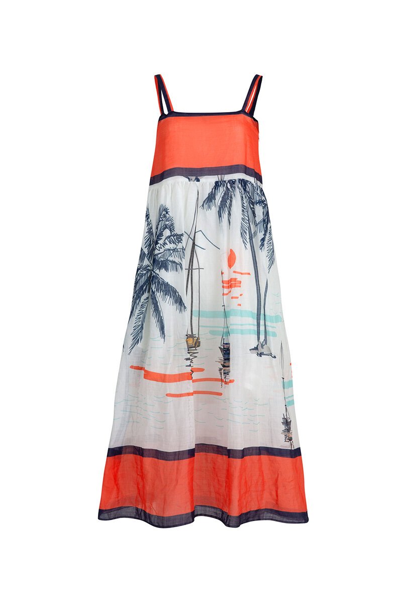 Breezy, beachy, and made for sun-drenched days, the On Deck Dress is your easy summer throw-on. The colour-blocked bodice meets a floaty printed skirt with a dreamy coastal vibe—think palms, sailboats, and warm holiday sunsets. Light, soft, and swishy, it’s the dress that instantly puts you in holiday mode.
