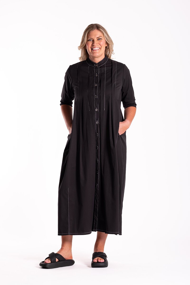 The Deeanne Hobbs French Me Dress is all about chic simplicity with a modern edge. Featuring a button-through front, mandarin collar, and subtle contrast stitching, this easy-fitting dress works beautifully layered or worn solo for an effortlessly polished look.