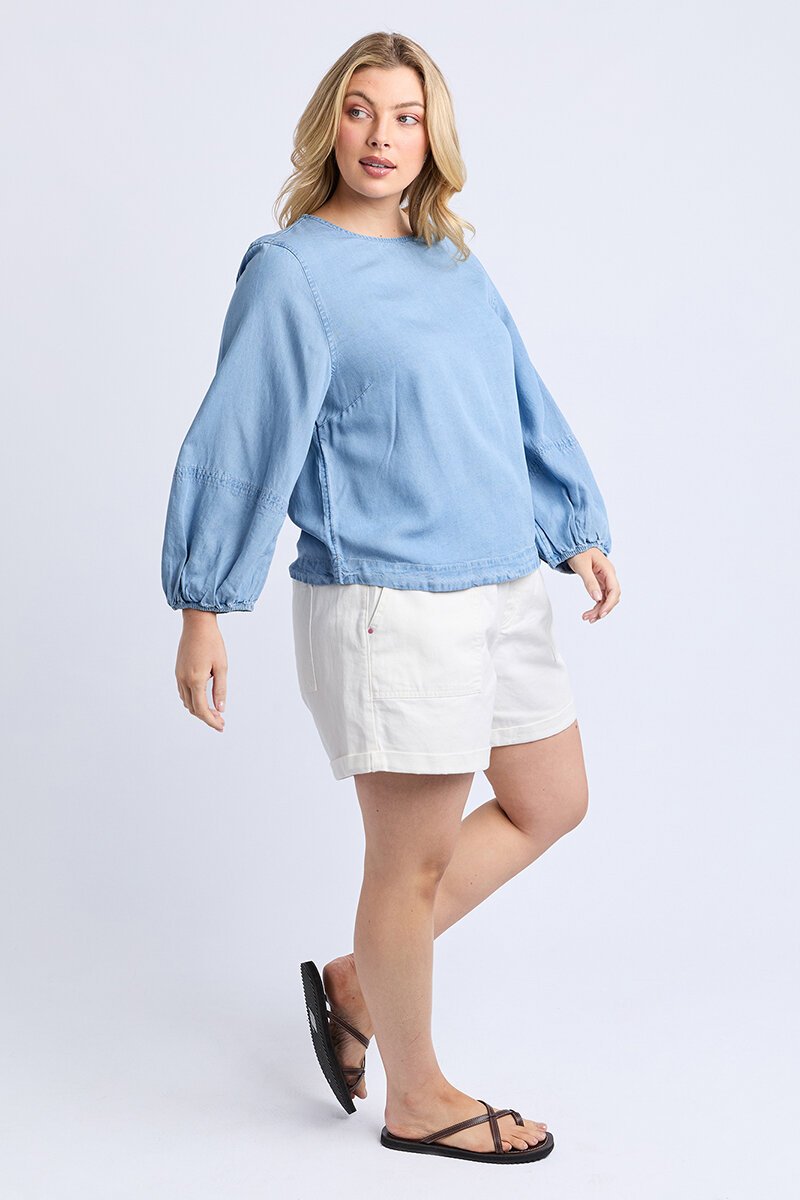 The Elm Della Chambray Top is your go-to for relaxed days with a polished edge. Made from soft, breathable chambray, it features a round neckline, subtle gathered sleeves, and a curved hem. Effortless with shorts or tucked into your favourite jeans for weekend ease.