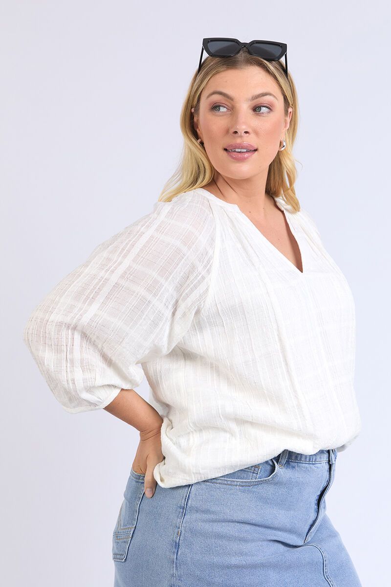 The Elm Isabella Blouse is a relaxed and feminine staple, featuring subtle textured detailing and a flattering V-neckline. Perfect for pairing with your favourite jeans or tailored pants for an effortlessly chic look.