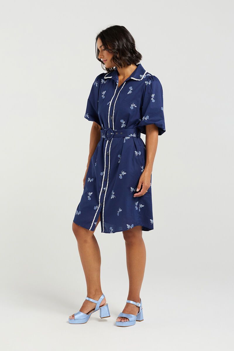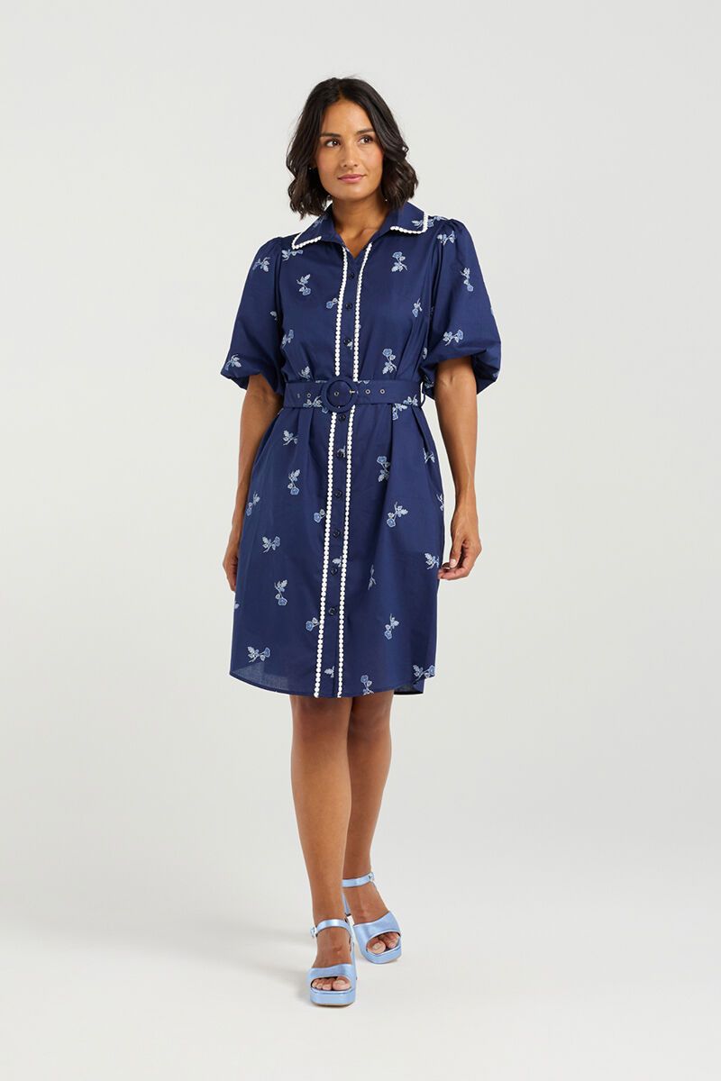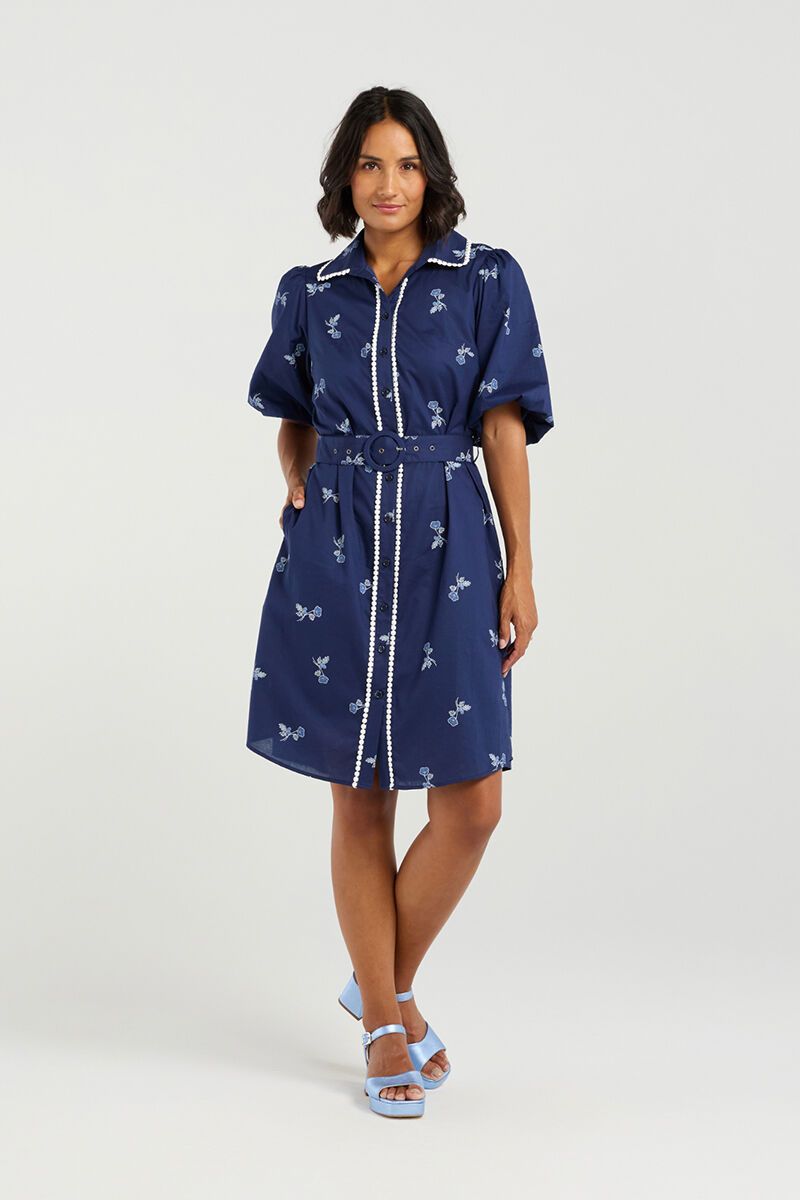 The Et Alia Emily Dress is a fresh shirt-style dress with a feminine twist. Designed with delicate embroidery, a belted waist, and pretty trim detailing, it’s a polished yet playful piece that works beautifully for both day outings and summer evenings.