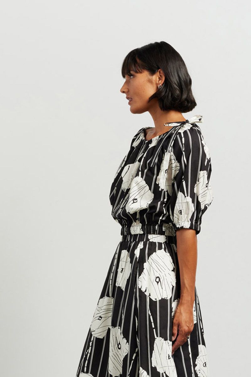 This pretty top, in high-quality cotton and our stunning Black Azalea print, is full of feminine charm. Its cropped length, gathered neck tie, and fuller sleeves make it perfect for high-waisted pants or skirts. Pair with the Ivy Midi Skirt for a chic co-ord set!