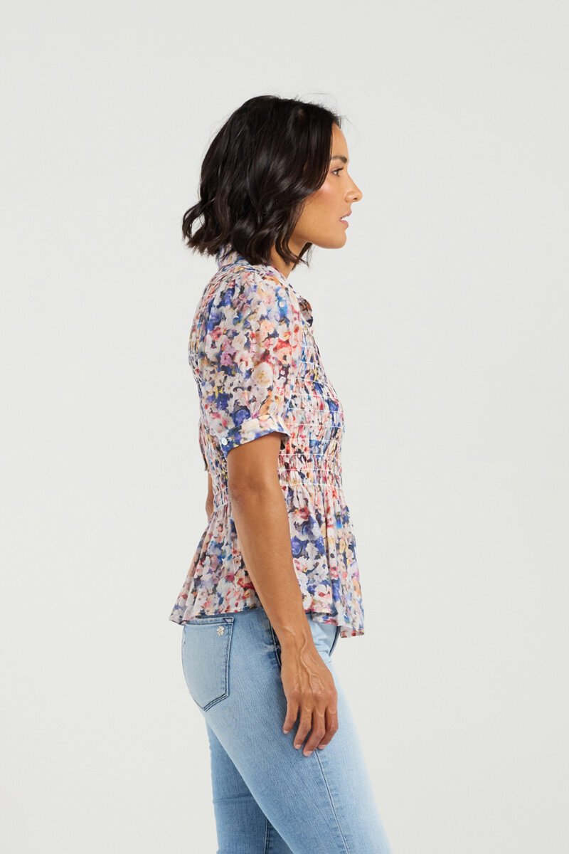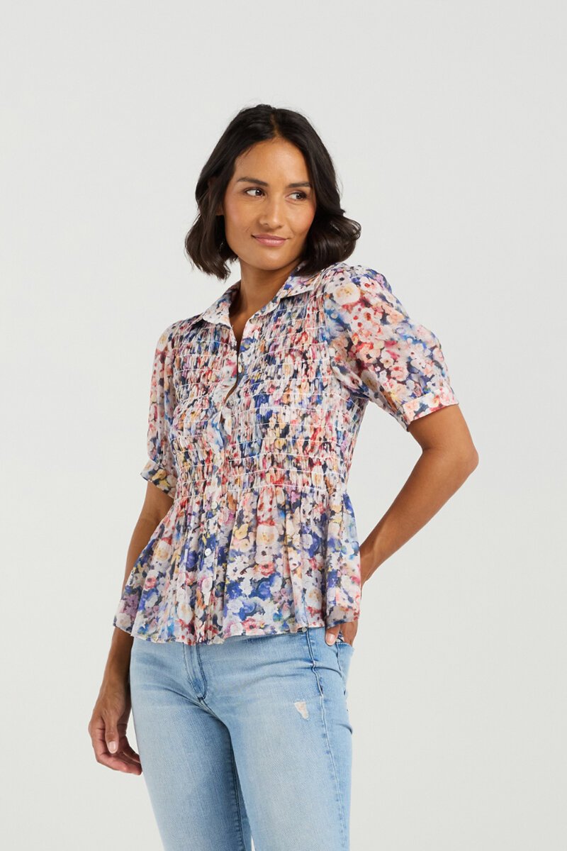The Et Alia Ruby Blouse is all about detail and texture, with its shirred bodice, collared neckline, and soft peplum hem. A flattering, easy-to-wear style that pairs beautifully with denim or tailored pants, making it a versatile go-to for any outing.