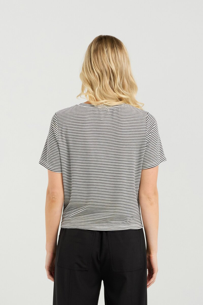 The Et Alia Stripe Twist Tee is a fresh take on a classic stripe. With its soft stretch fabric, subtle candy stripe, and flattering front twist detail, it’s the perfect piece for easy everyday style—ideal with jeans, shorts, or skirts.