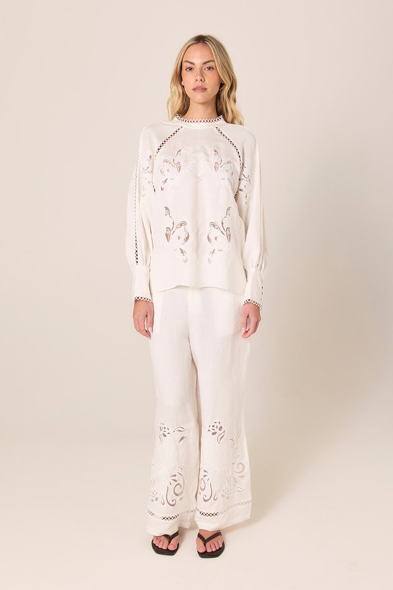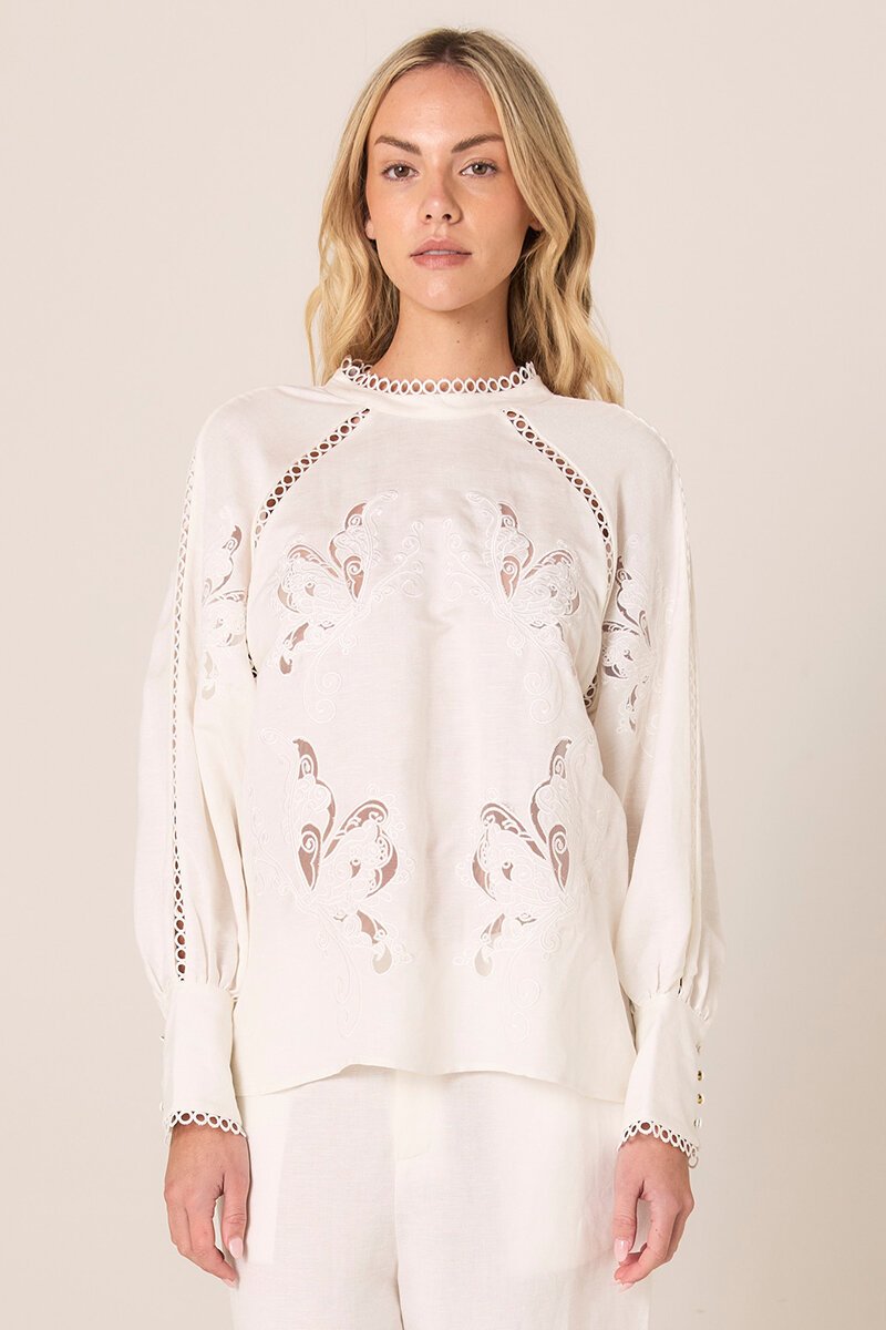 The Fate + Becker Aven Embroidered Blouse brings soft elegance to everyday dressing. Delicate embroidery, sheer detailing and a relaxed fit make it an easy standout with denim or tailored pants.