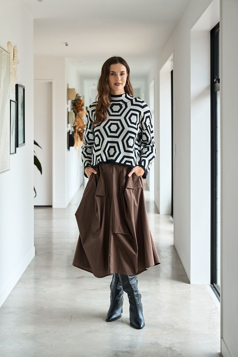 The Foil Contrast Pull On Skirt is an on trend skirt with a fun shape created with contrast stitching. It makes this skirt more interesting than the rest.