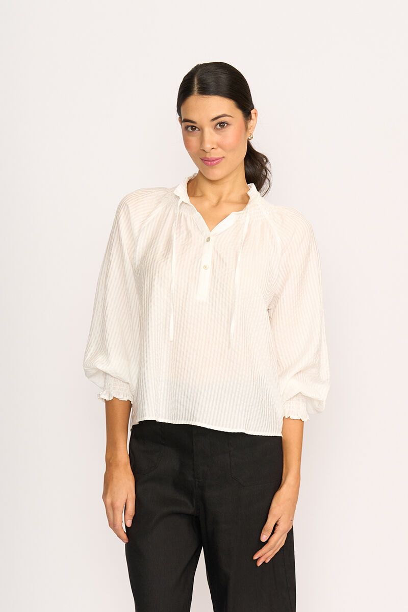 The Foil Just Chillin' Stripe Top is relaxed yet refined. With soft gathers at the neckline, elastic cuffs, and a curved hem, it’s the kind of effortless piece that goes with jeans, trousers, or layered under a blazer for a twist.