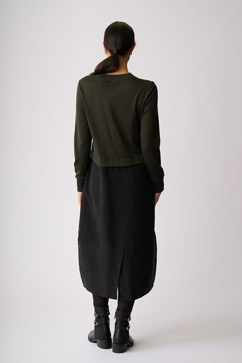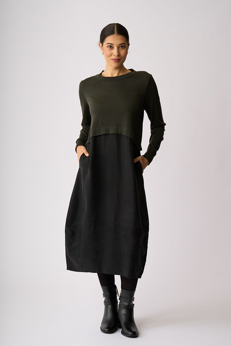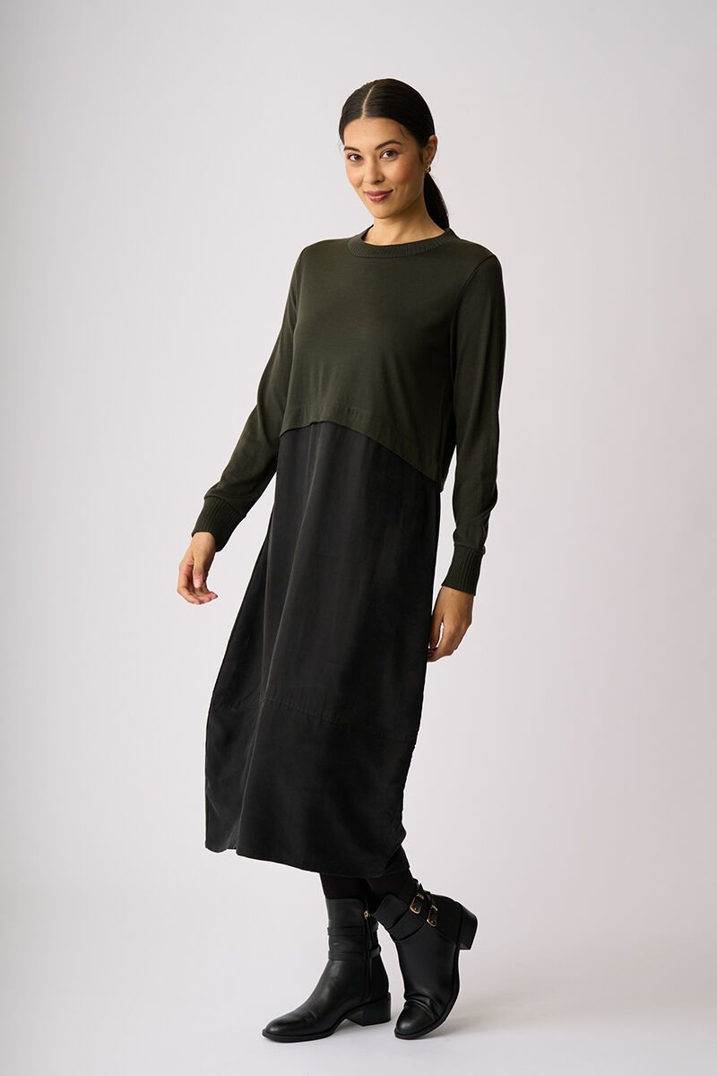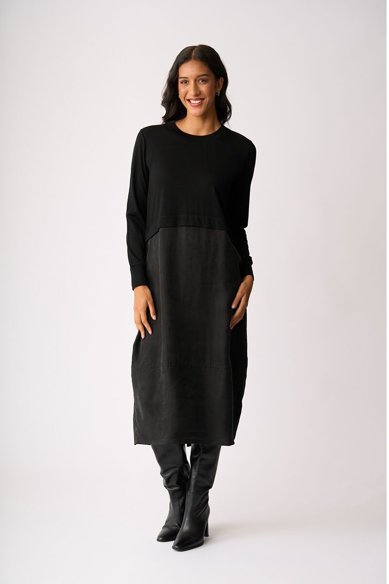 Soft, fluid and beautifully balanced. The Mix Things Up Dress blends a gentle knit bodice with a flowing woven skirt, creating shape without cling. Feminine, flattering and effortlessly polished for everyday wear.