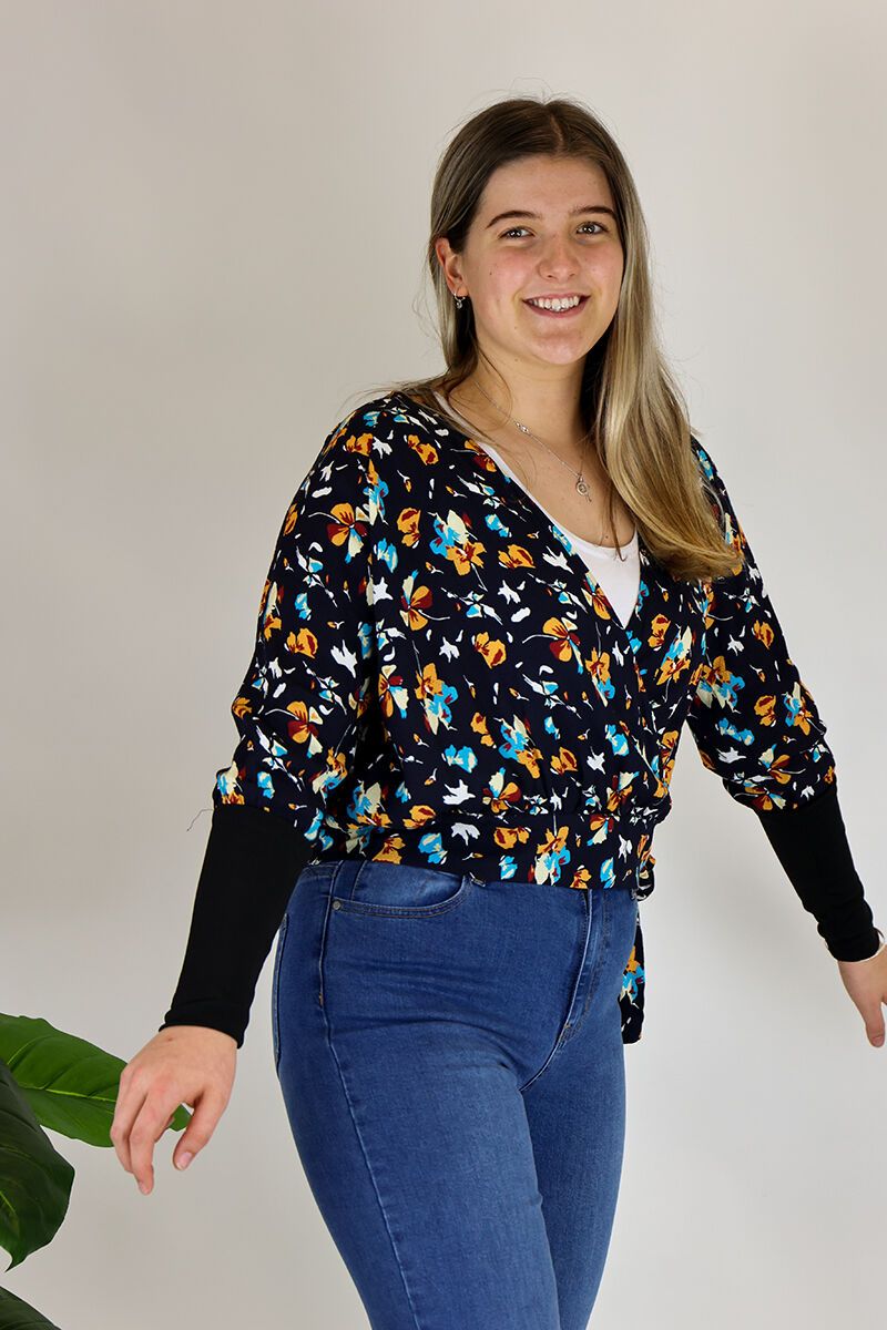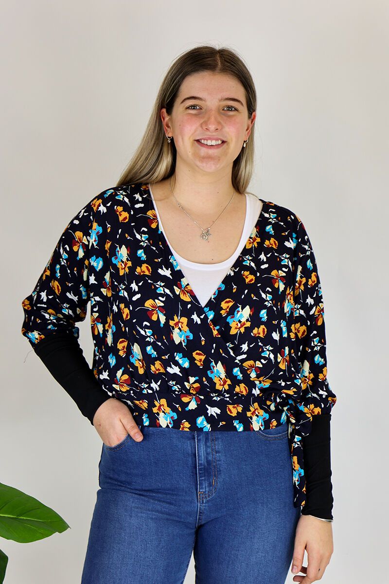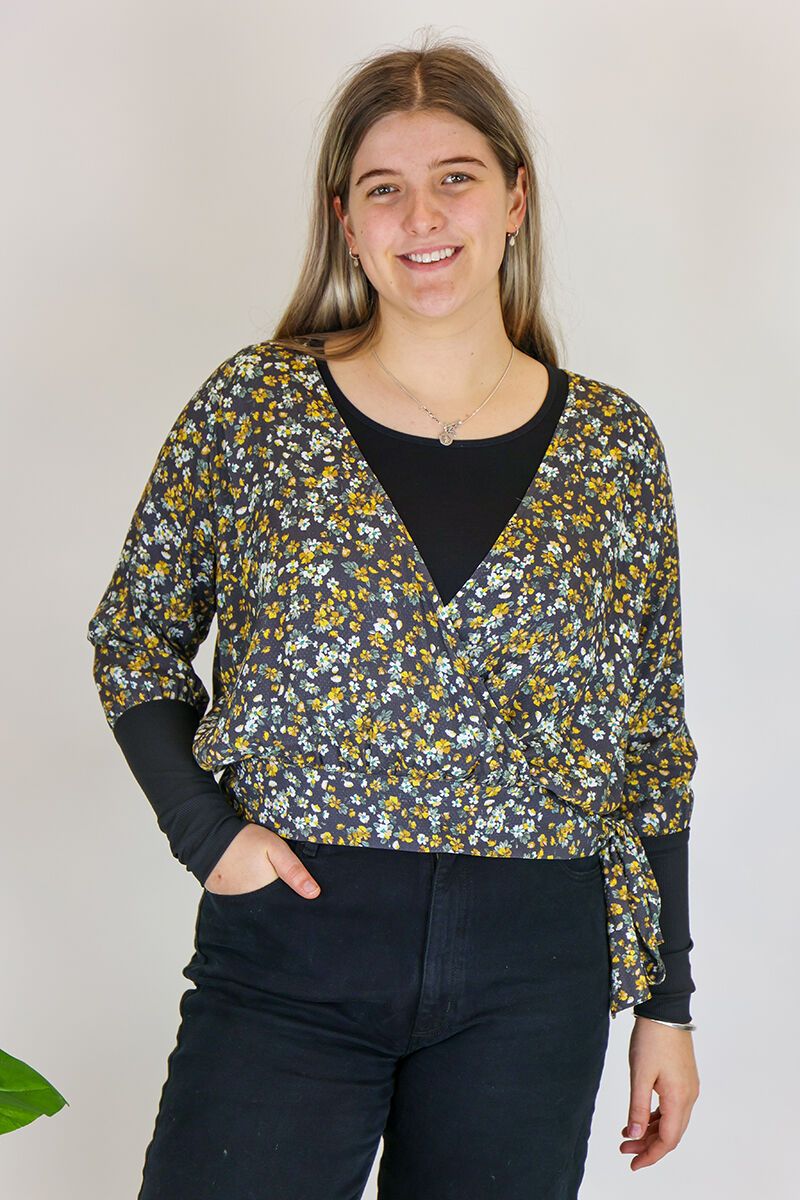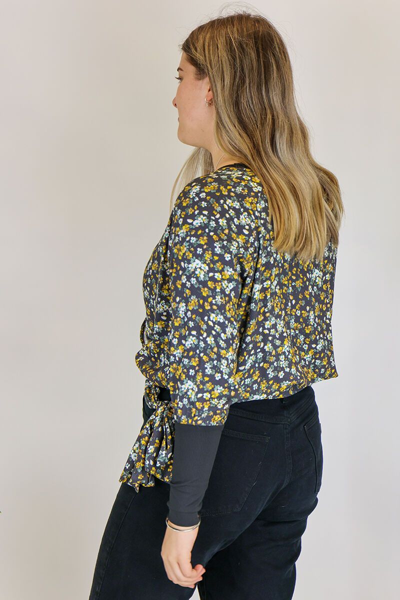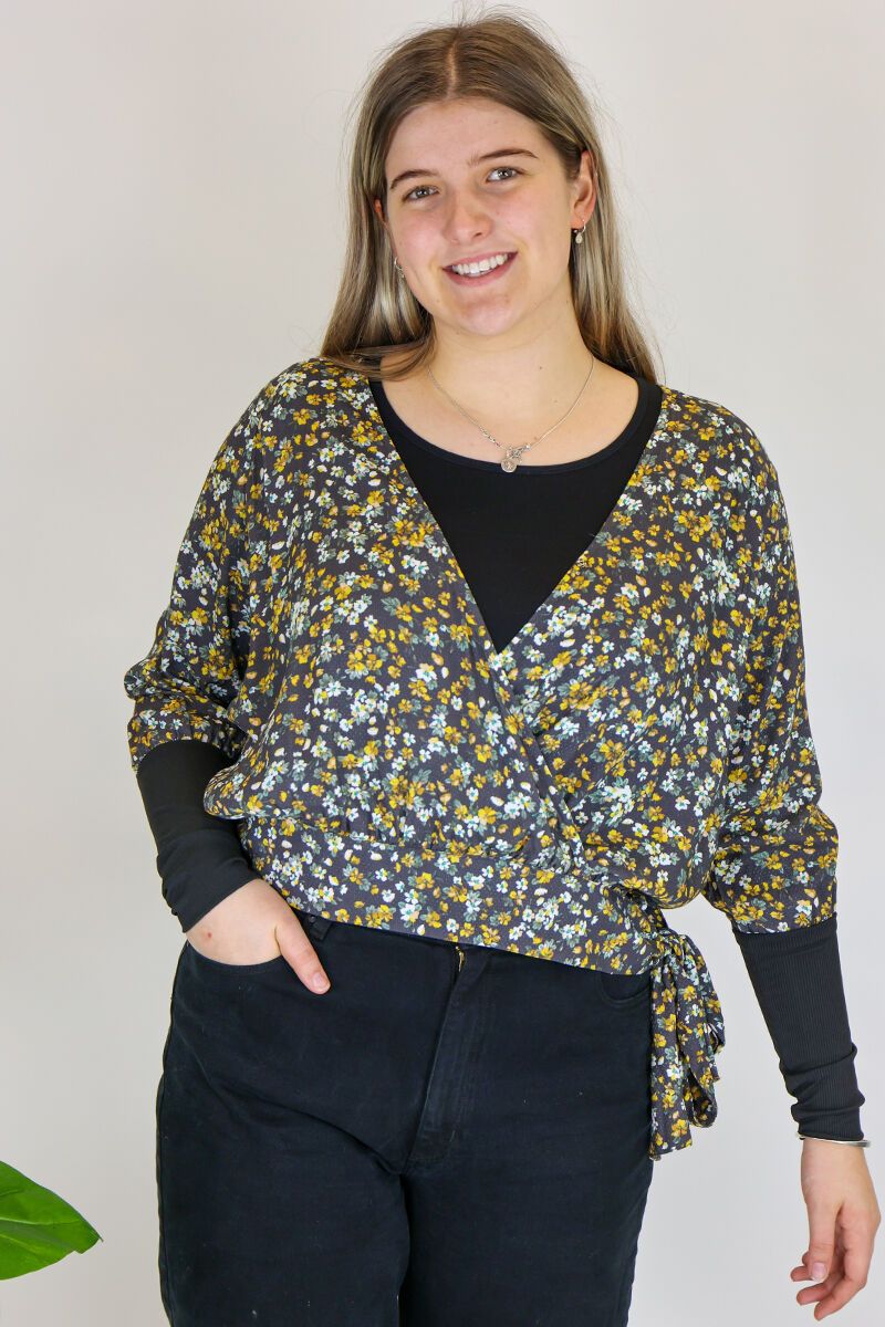 This Foil Top is a v neck, faux wrap style with a tie at the hip. Team it with jeans for a layered look.