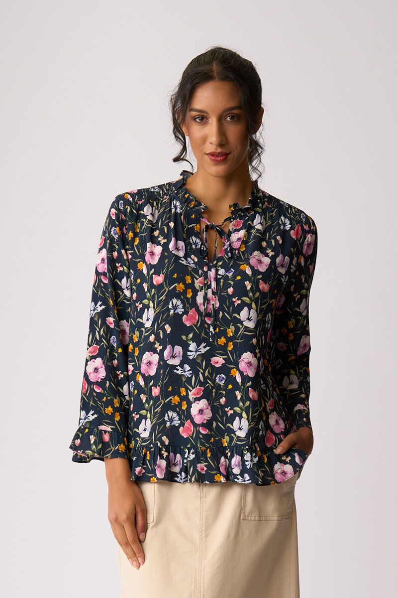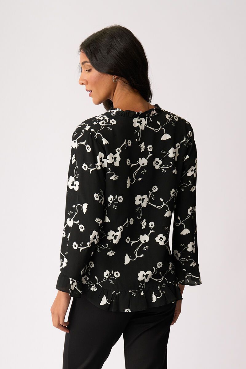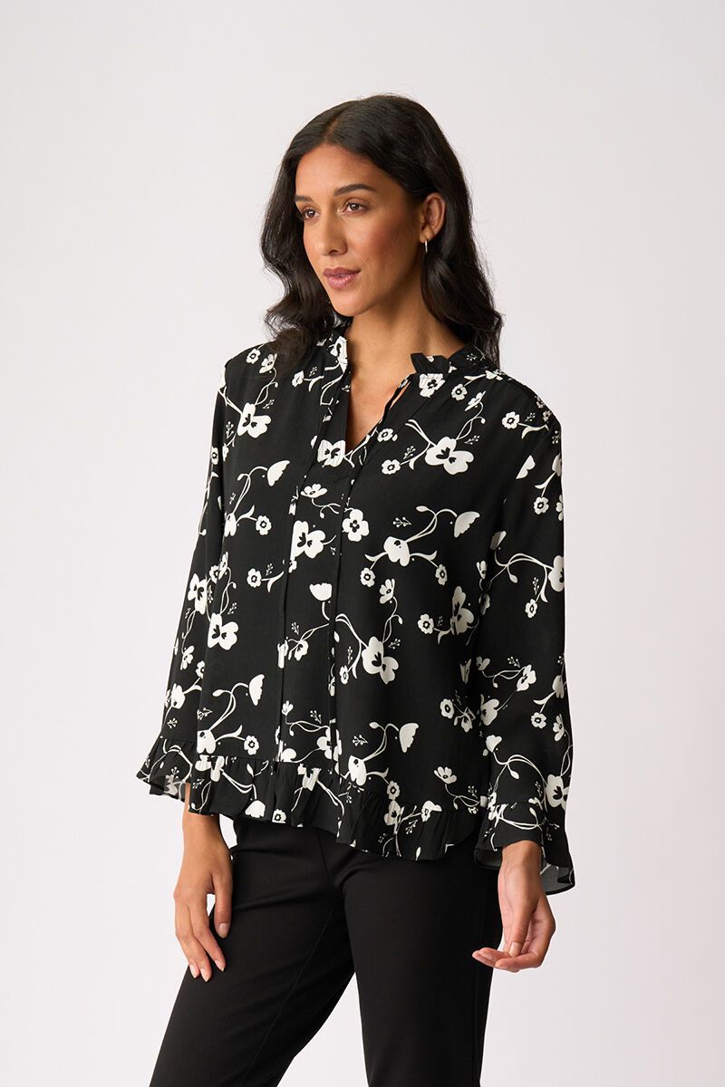 Softly romantic with a playful finish. Featuring a delicate ruffle neckline, gentle flare sleeves and a floaty scoop hem with frill detail, this top moves beautifully and adds instant femininity to your day.