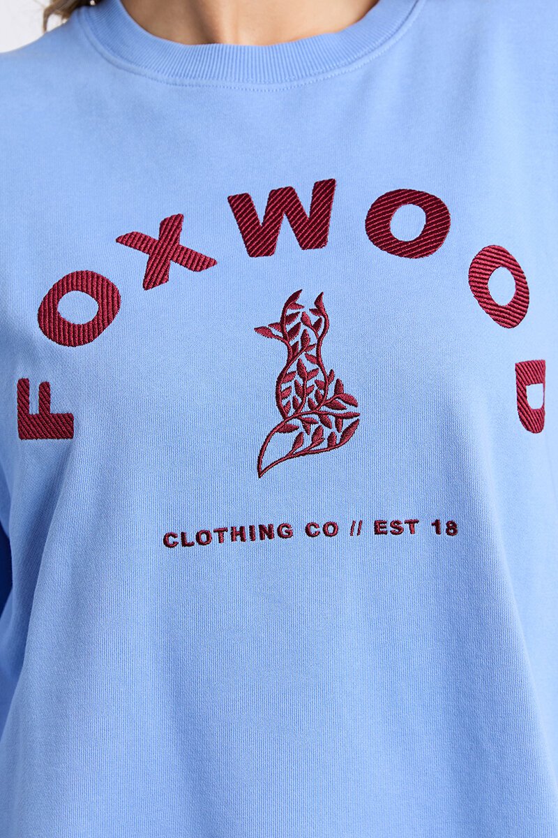 The Foxwood Effortless Contrast Crew has a beautiful blue base with an on trend wine coloured logo.