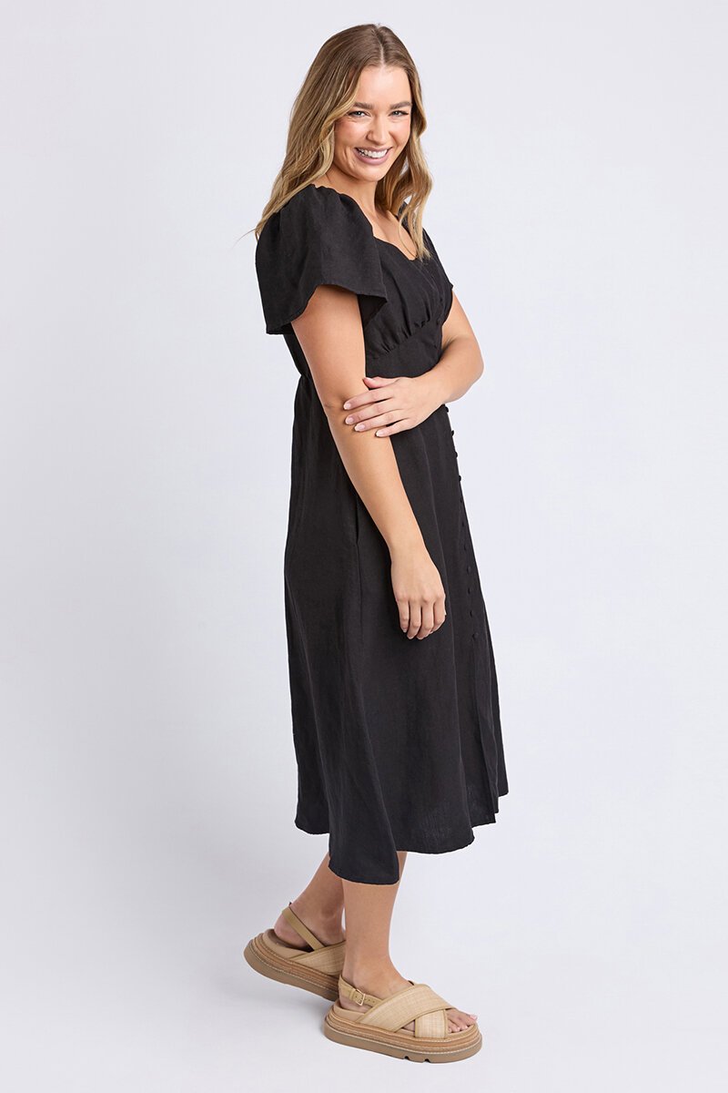 The Foxwood Juni Dress is the perfect mix of feminine and easy. Designed in a lightweight linen blend, it features flutter sleeves, a sweetheart neckline, and covered button detailing down the front. Effortlessly flattering — dress it up with sandals or keep it casual with slides.