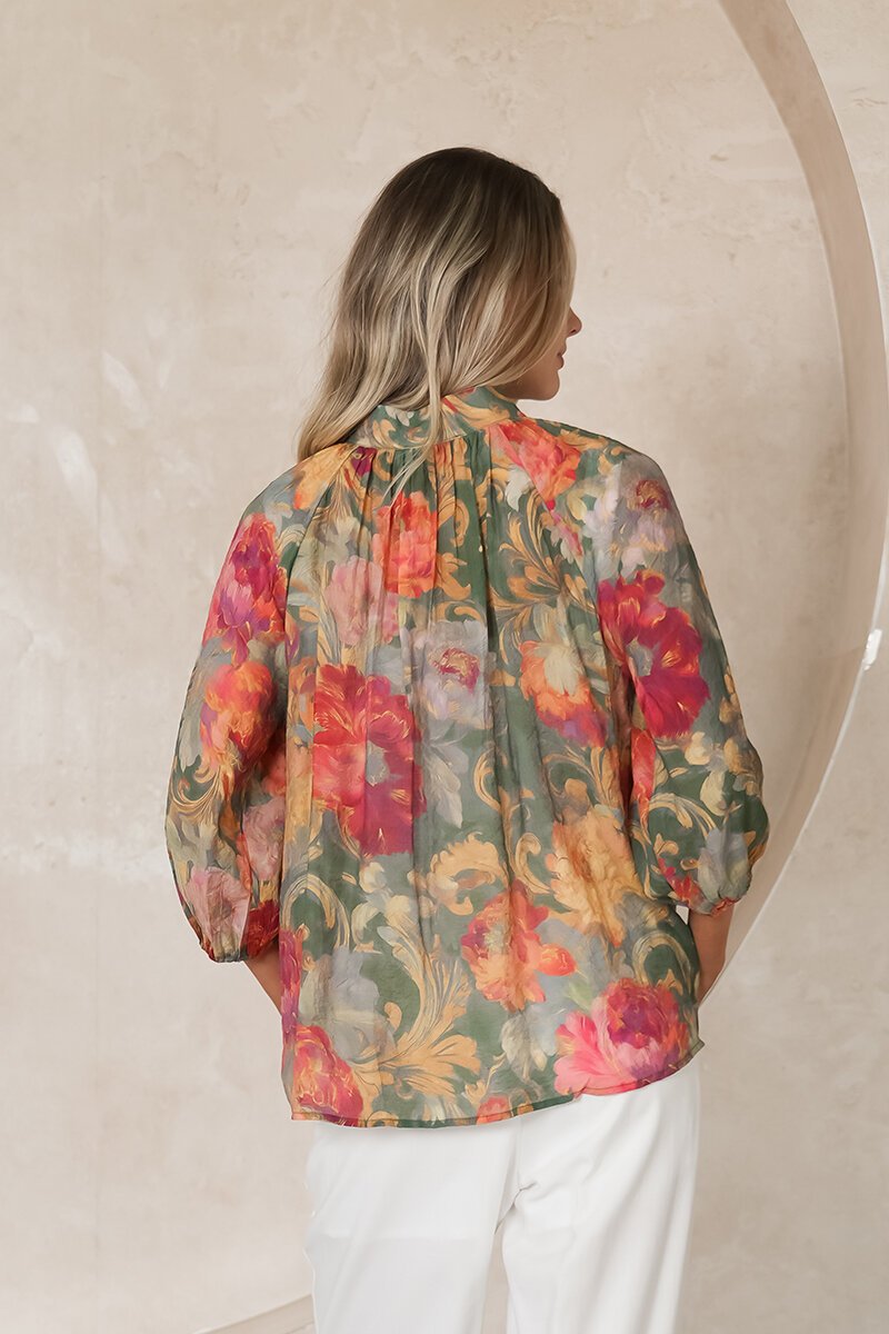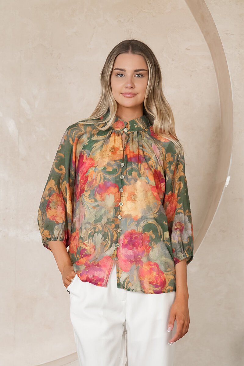 Button frontAll over patternRound neck Button cuffsNo stretchRelaxed fit