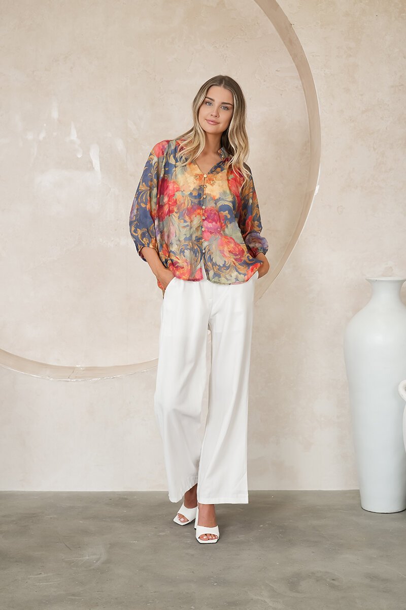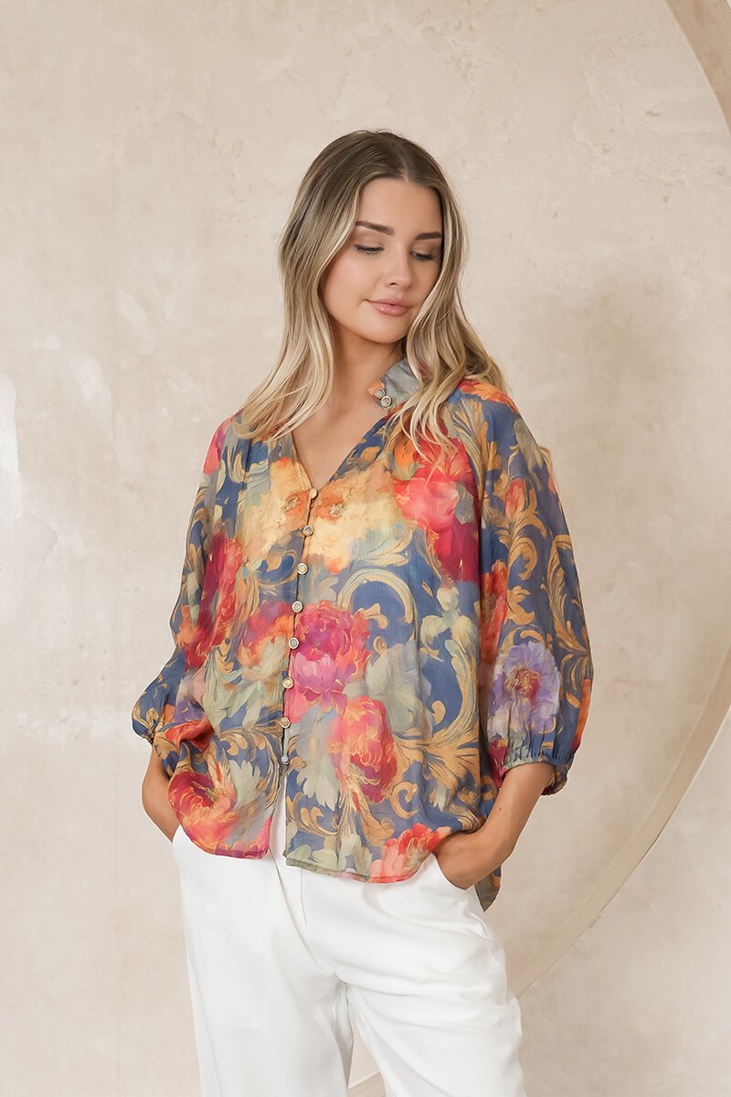 The Fria The Label Baroque Rose Blouse brings a touch of vintage romance to modern dressing. With its painterly floral print, soft billowy sleeves, and gold button detailing, it’s the perfect blend of relaxed elegance and timeless style. Dress it up or down with ease.