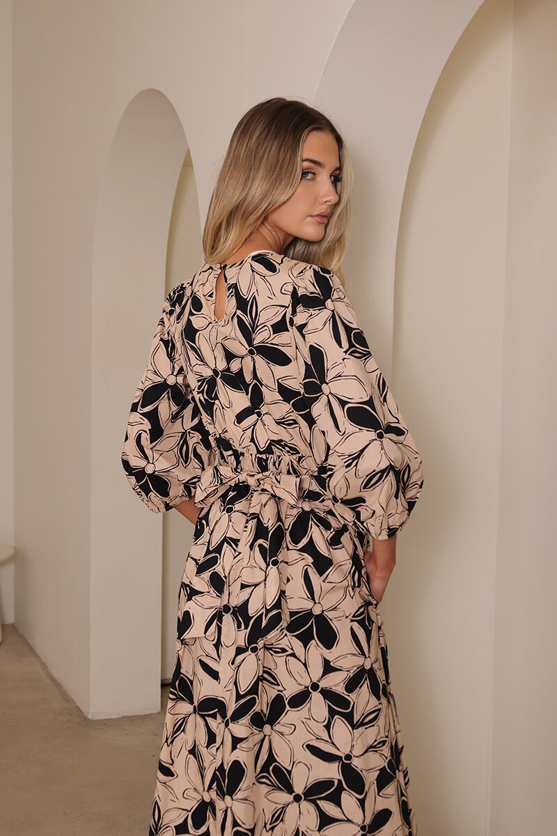 The Fria The Label Flower Balloon Midi Dress is understated elegance with a modern edge. Its flowing silhouette, statement print, and cinched waist make it an easy choice for warm days. Dress it up with heels or keep it cool with slides and sunnies.