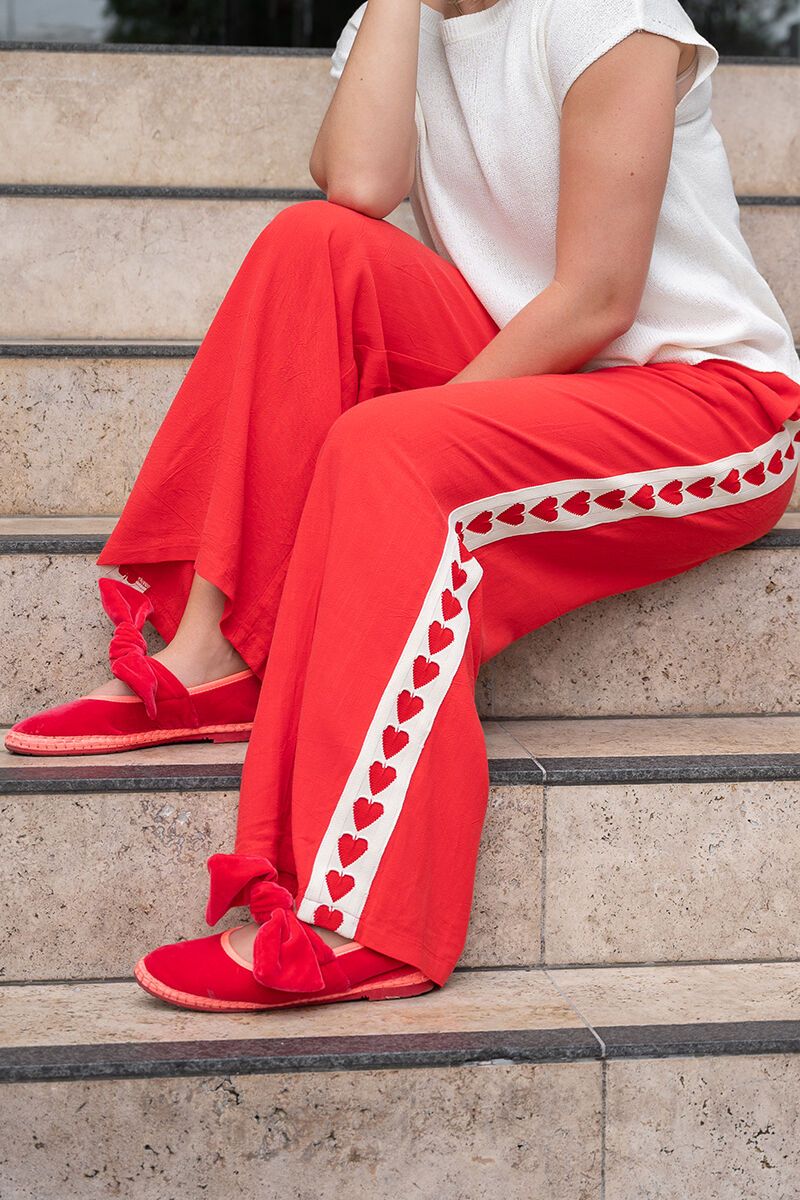 The Fria The Label Heart Tape Pants turns heads with a playful heart trim down the side. A comfy drawstring waist and wide-leg shape make them perfect for relaxed weekends with an elevated edge.