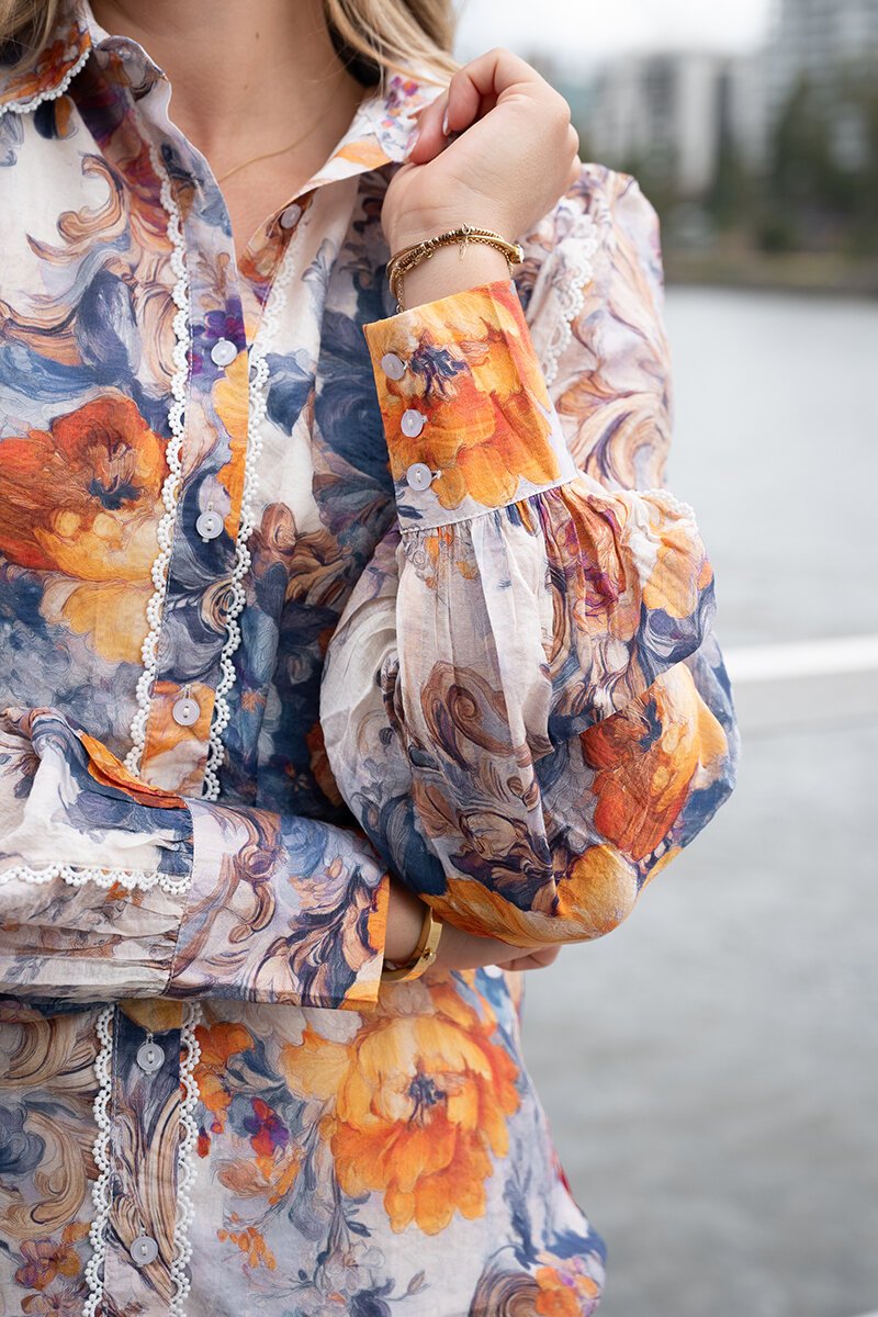 The Fria The Label Vintage Rose Lace Trim Blouse blouse showcases striking blue-orange florals with delicate lace-trim accents. Its airy fit and full sleeves create a romantic, wearable look—perfect for pairing with navy trousers, denim, or tailored pieces for day-to-evening style.