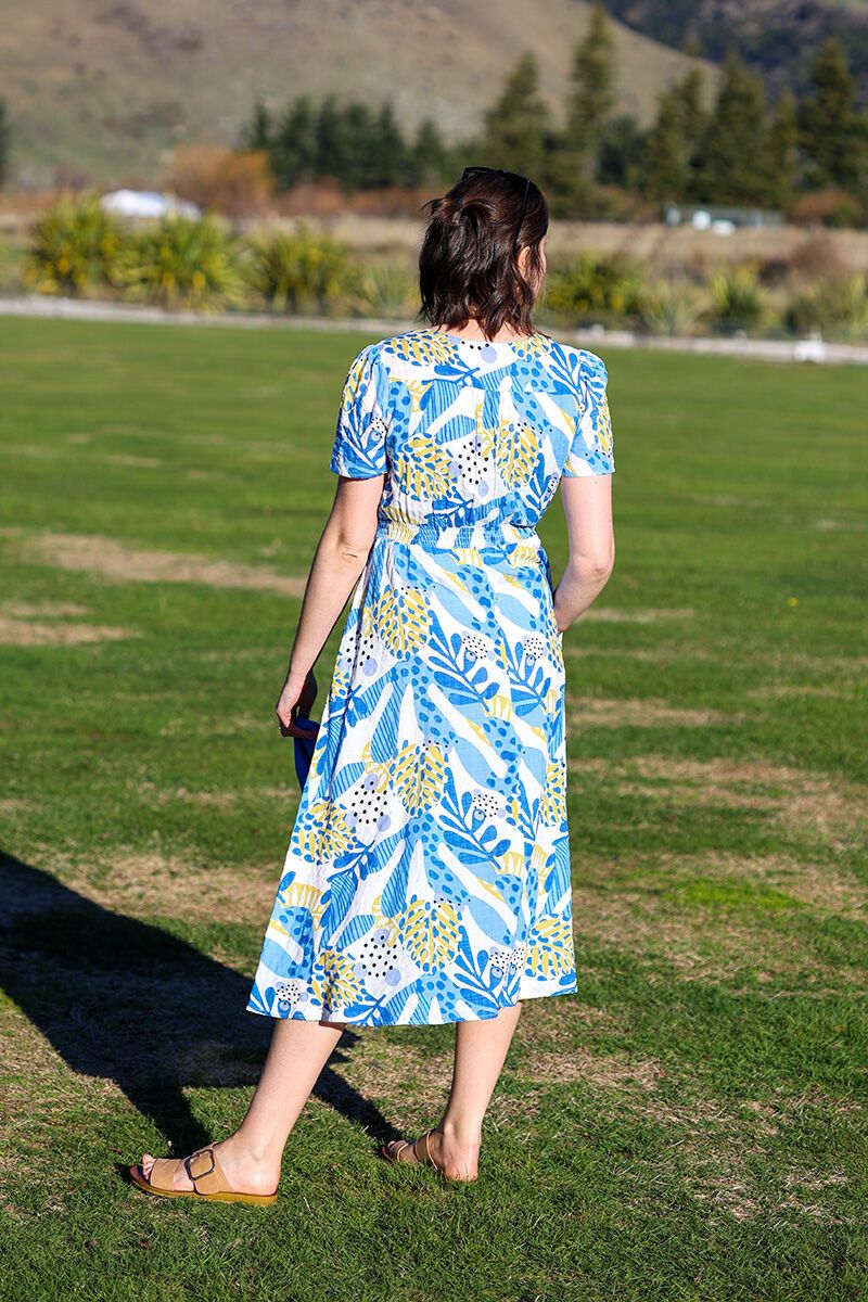 The Glam Blue Bayside Dress is made for sunny days, with its soft v-neckline, short sleeves, and flattering gathered waistline. The bold blue and yellow print brings a playful, breezy feel—perfect for garden parties, weekend outings, or relaxed holiday wear.