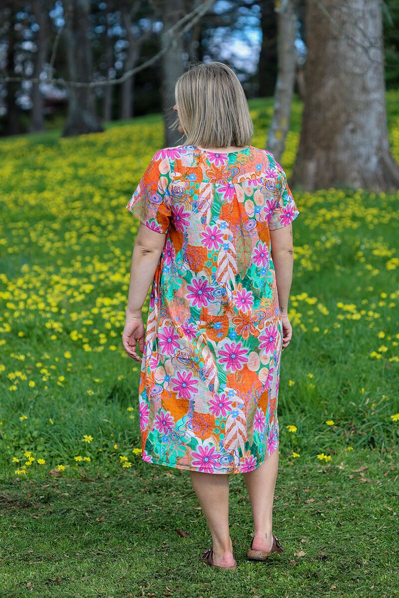 The Glam Orange Lumen Dress is a burst of colour and fun. With its vibrant floral print, pintuck detailing through the bodice, and relaxed short sleeves, it’s designed with an easy fit and pockets for everyday comfort. A cheerful style for sunny days.