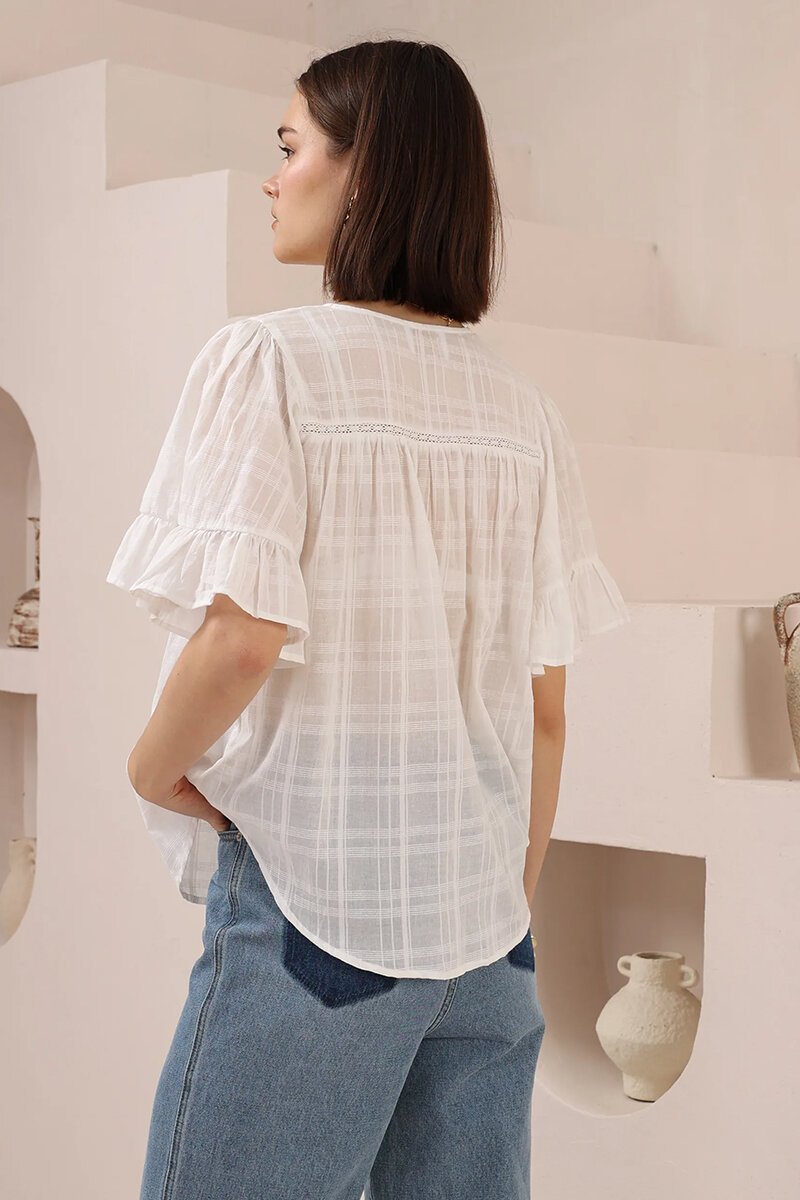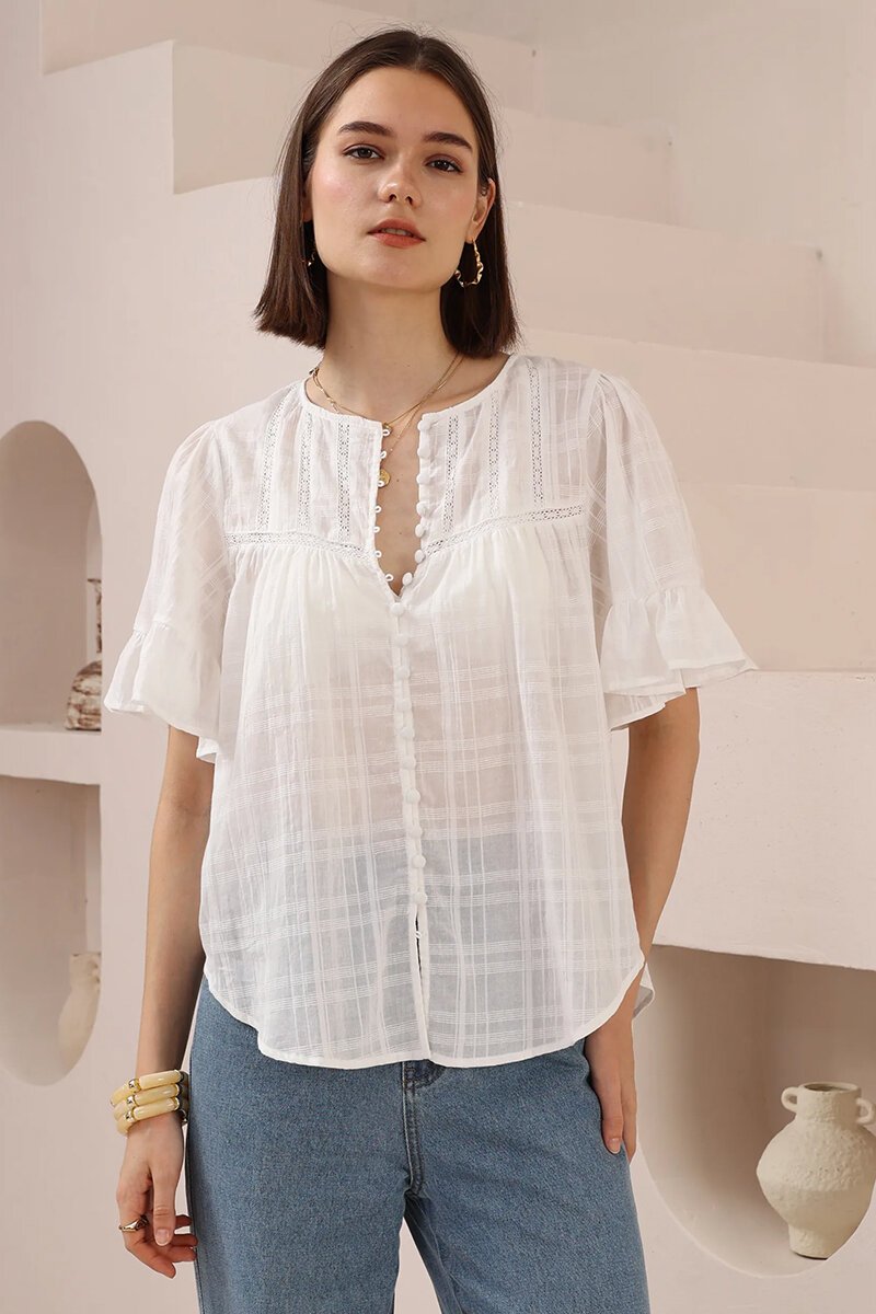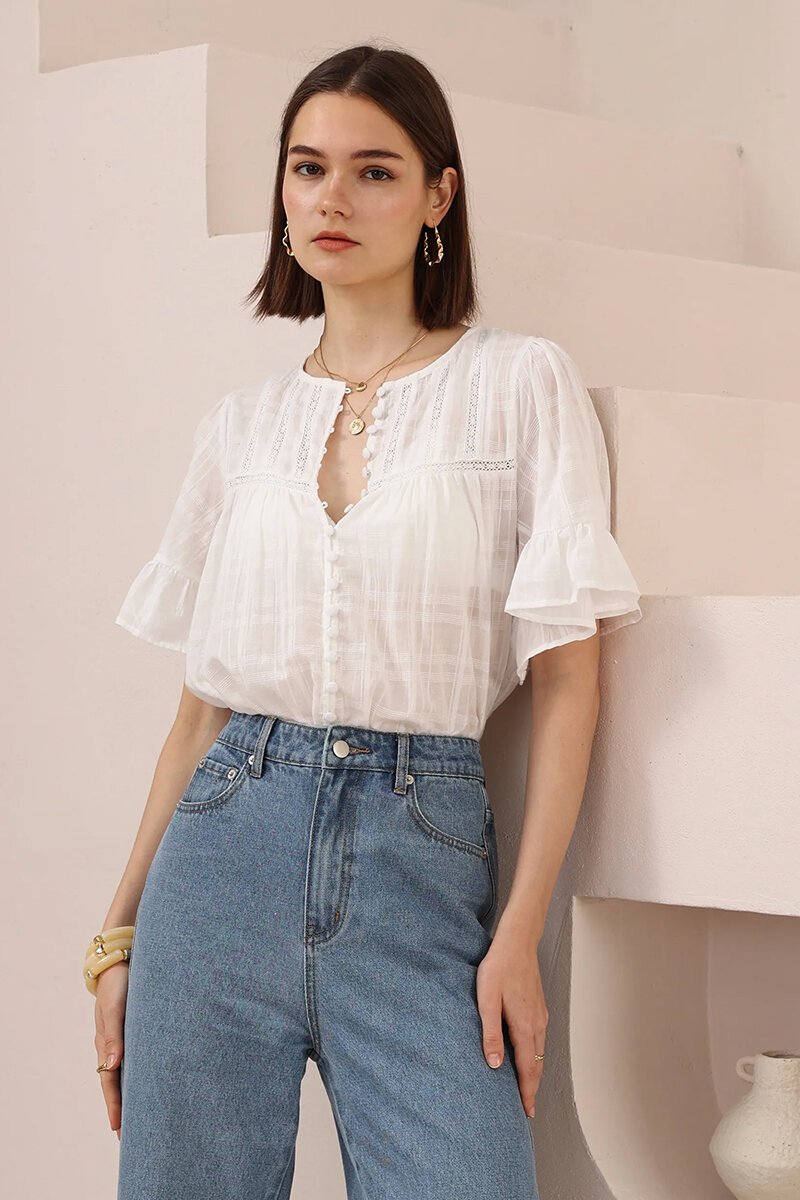 The Iris Maxi Blouse is light, airy, and beautifully detailed. Featuring delicate button-down front detailing, soft flutter sleeves, and subtle lace trims, it’s the perfect blend of relaxed charm and refined style—ideal for pairing with denim or flowing skirts.