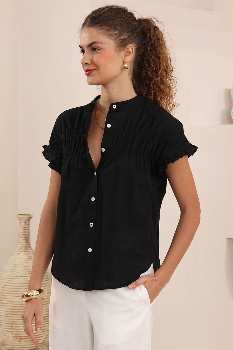 The Iris Maxi Button Front SS Top is simple, polished, and easy to style. With its soft gathers, relaxed short sleeves, and clean button-up front, it’s an effortless everyday piece—perfect with denim, wide-leg pants, or a summer skirt.