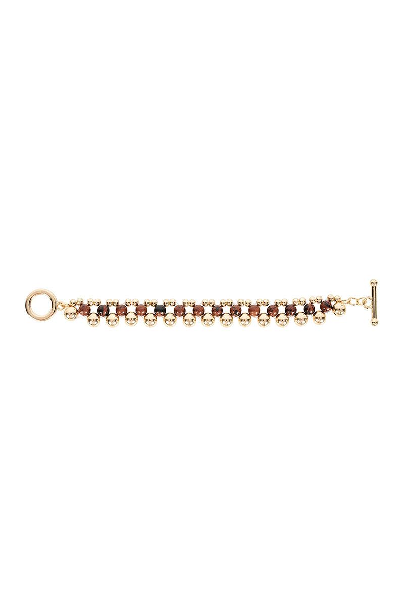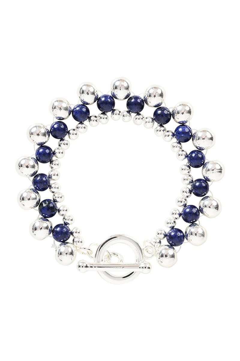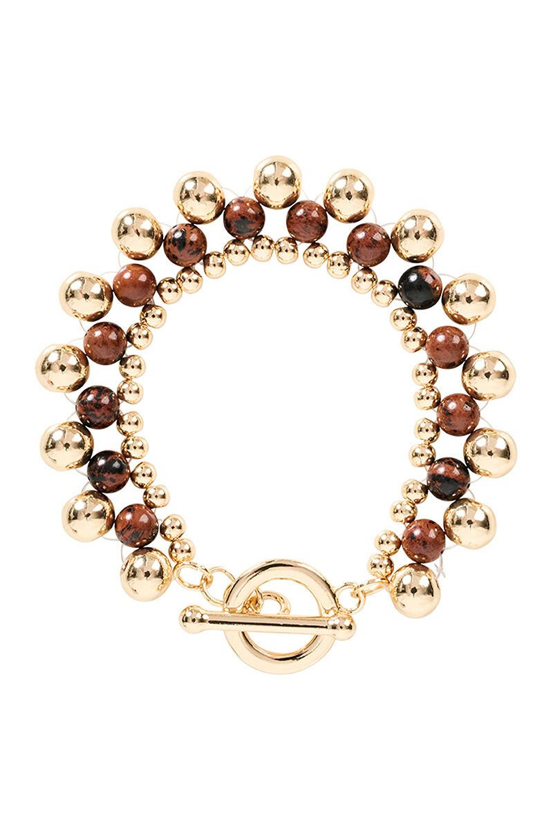 The Darby Bracelet blends polished metal beads with natural stone accents for a bold, layered look. Finished with a statement toggle clasp, it’s an eye-catching piece that elevates everyday styling.