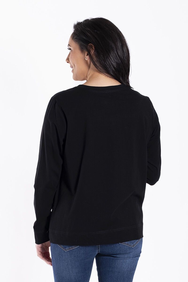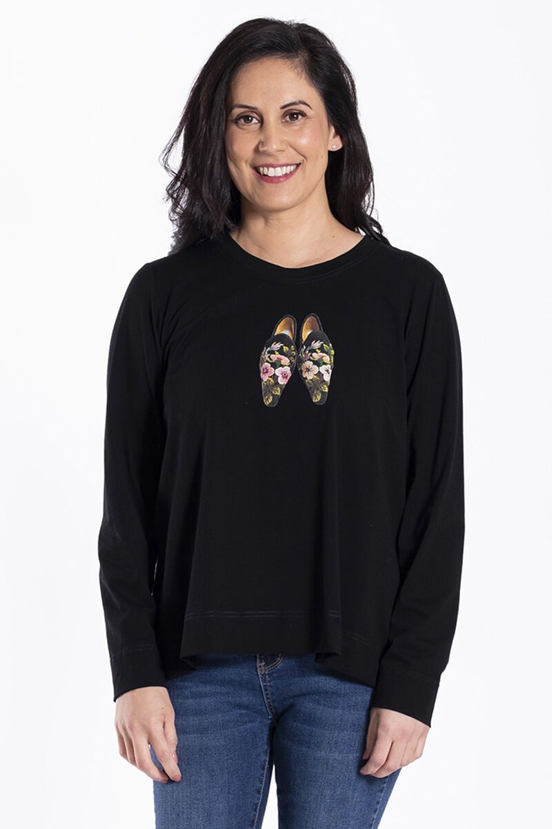 The Jellicoe Basic Tee Noir Shirt is an everyday top with a little personality. Featuring a relaxed shape, long sleeves and a charming shoe graphic, it’s a fun piece that pairs effortlessly with your favourite denim.