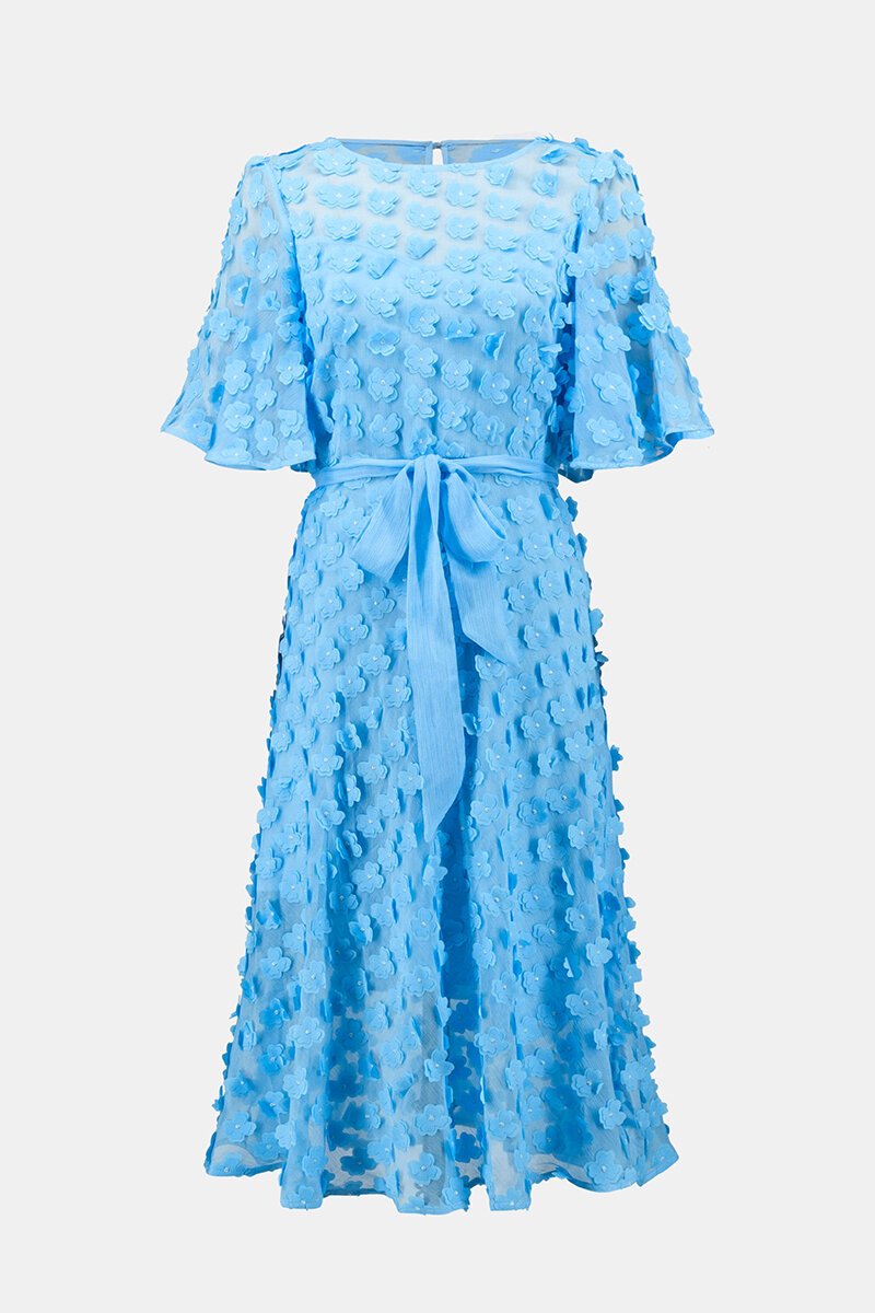 The Joseph Ribkoff 3D Embroidered Belted Chiffon Dress is the definition of elegance with a playful twist. Crafted from sheer chiffon and covered in delicate 3D appliqué detailing, it floats beautifully with every step. The matching tie belt cinches the waist for a flattering silhouette, while soft flutter sleeves add effortless movement. Perfect for weddings, garden parties, or any moment that calls for a little magic.