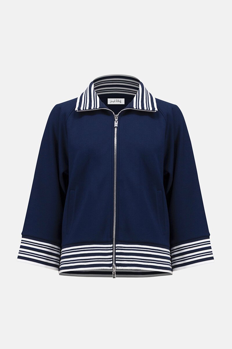 The Joseph Ribkoff Scuba Jersey Jacket — sporty yet refined. Featuring bold striped trims and a structured zip-front silhouette, this jacket adds instant polish to casual looks. The scuba jersey fabric offers soft stretch and shape retention, keeping you effortlessly chic from day to night.