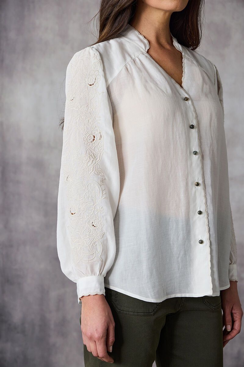 The Lania The Label Dash Shirt is a soft, feminine shirt with delicate embroidered sleeves and a lightweight feel, perfect for layering or wearing on it's own with denim or tailored pants.