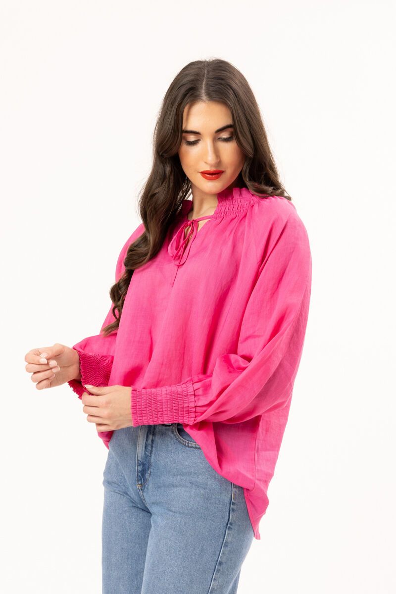 The Leila + Luca Encourage Top is a vibrant statement piece that instantly brightens your outfit. Featuring a soft gathered neckline with tie detail and billowy sleeves with shirred cuffs, it’s an easy blouse to pair with denim or tailoring.