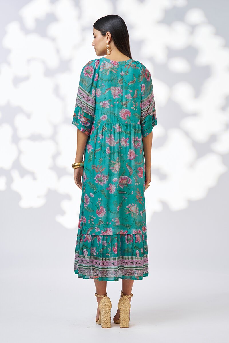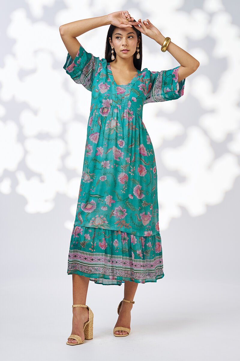 he Anaphora Midi Dress is your shortcut to easy summer polish. With a panelled front that creates a flattering V neckline, breezy sleeves, and a tiered hemline that moves beautifully, it’s made for long lunches and special occasions alike. The body is fully lined, keeping comfort top of mind.Garment Features