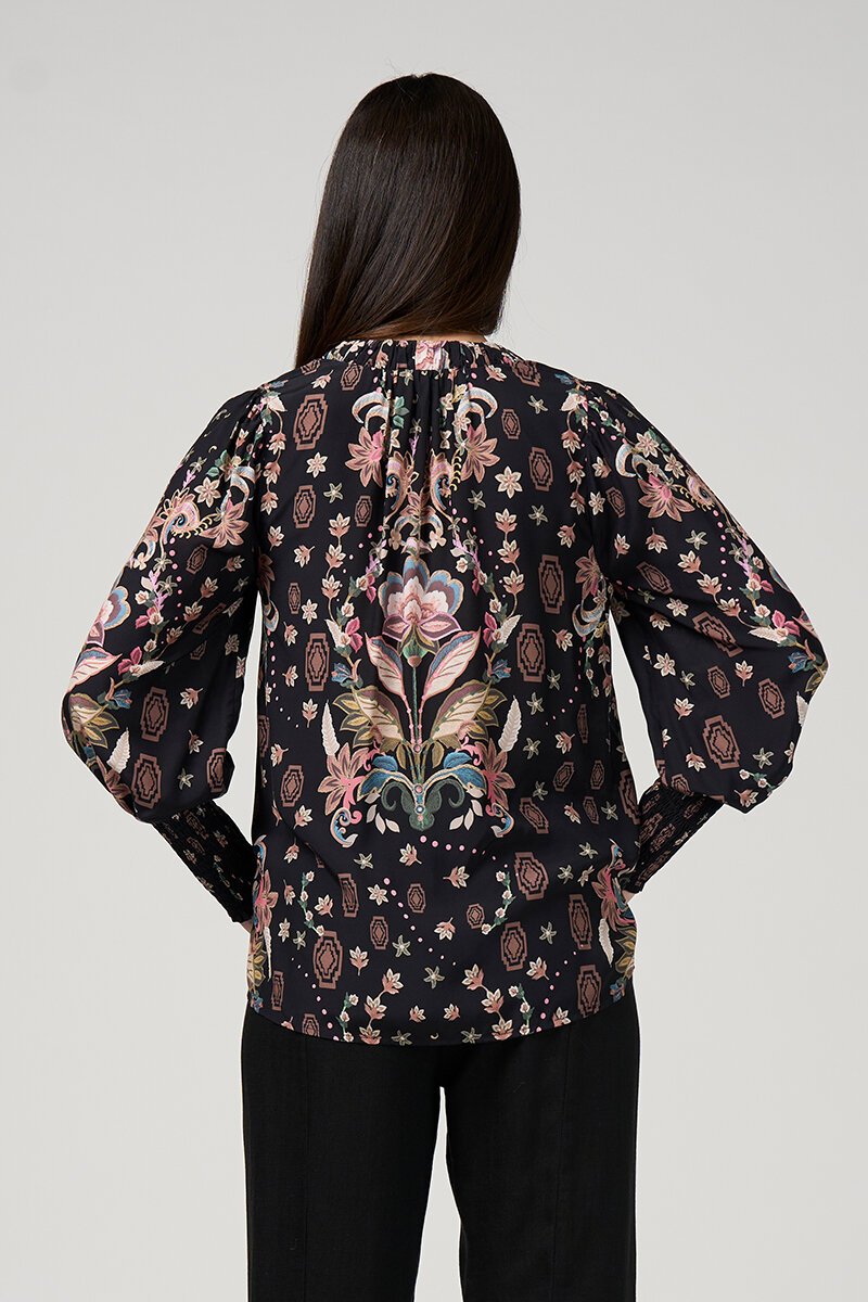 The Loobies Story Antoinette Blouse is a luxurious silk-blend style with a softly ruched V-neckline and floaty blouson sleeves, finished with deep shirred cuffs for an elegant, feminine shape.