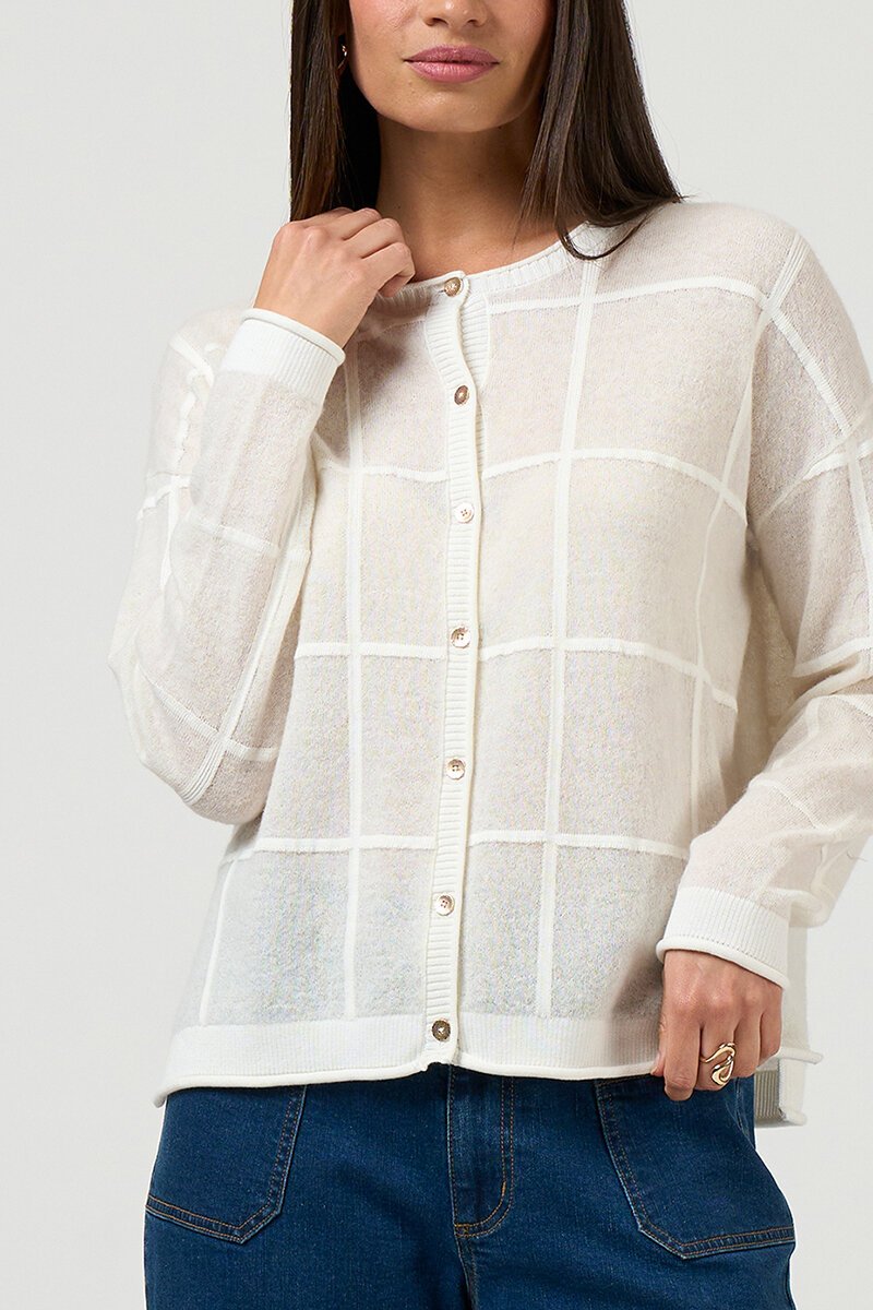 The Loobies Story Astoria Cardi is a soft, lightweight knit with a modern edge. Designed with a subtle check texture, contrast panel detailing and easy side splits, it’s an elevated layer you’ll reach for again and again.
