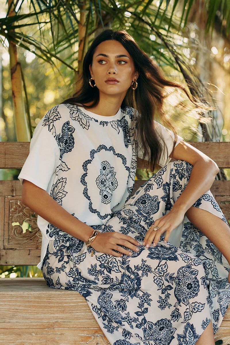 An elevated essential with a twist. The Indie Tee combines the ease of cotton with a silk blend front panel showcasing a custom floral print. Pair it with the coordinating Indie Skirt for a sophisticated, put-together look with a soft, feminine edge.