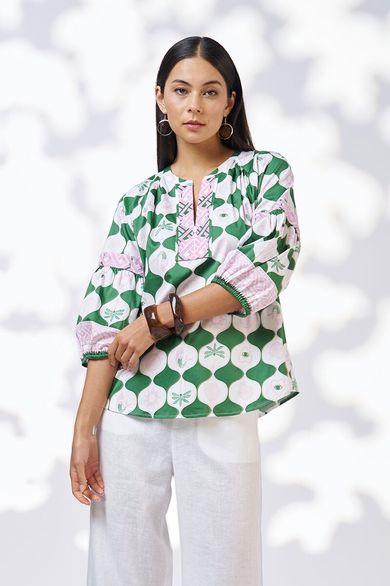 The Kya Blouse is all about easy drama—think bold print, relaxed shape, and sleeves with just the right amount of volume. With its V-neck placket and floaty raglan cut, it’s the kind of blouse that moves beautifully whether you’re desk-bound or dancing.