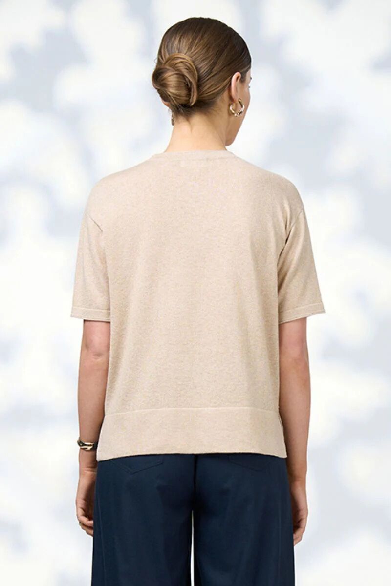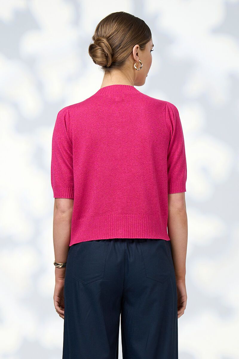 A wardrobe staple with a subtle shimmer, the Mica Cardi is a cropped, button-through knit with a refined, feminine feel. Featuring soft short sleeves and ribbed trims, it’s easy to layer and effortlessly polished—whether buttoned up or worn open.