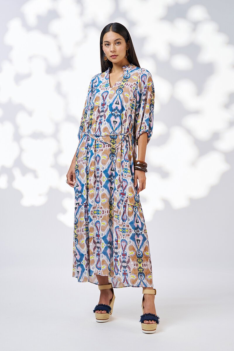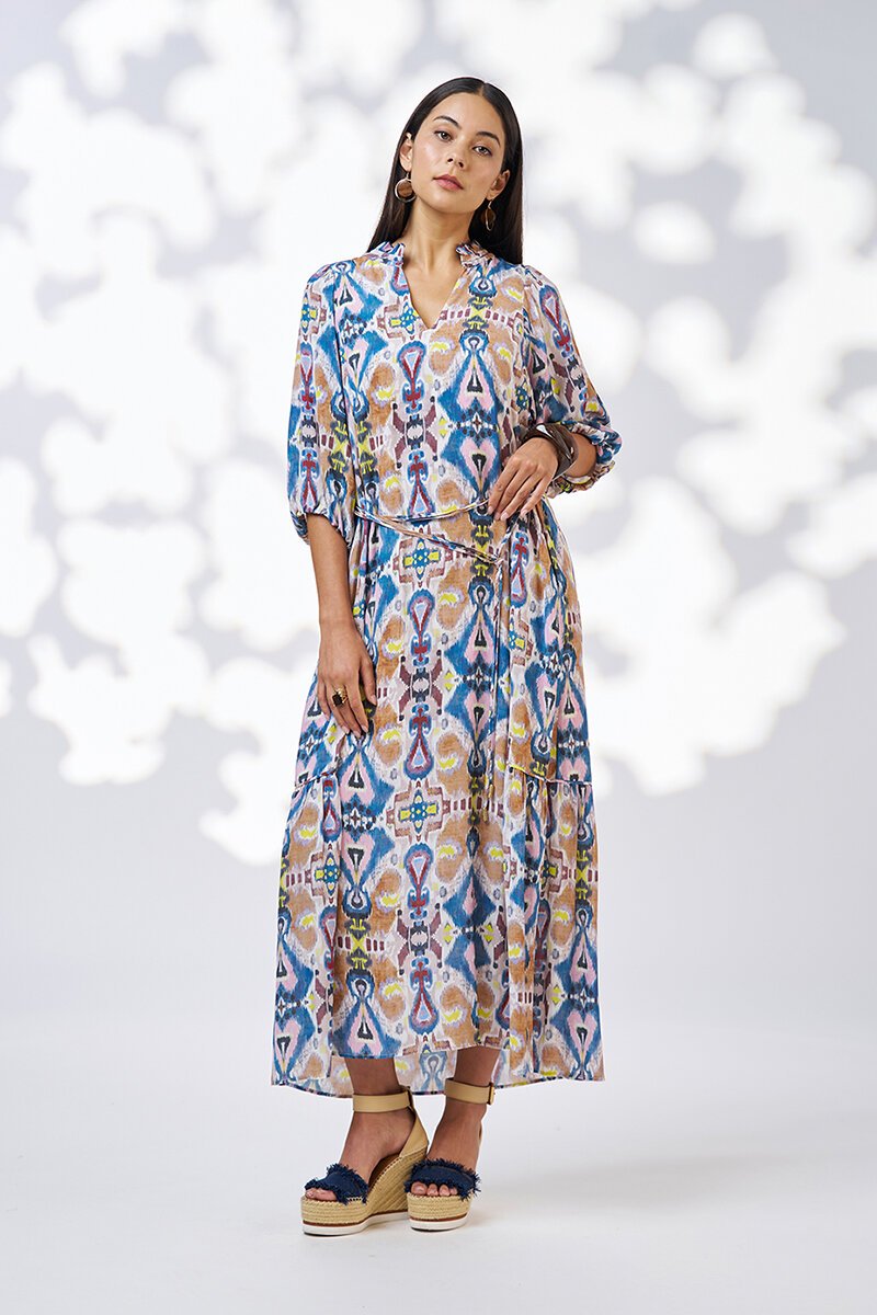 The Loobies Story Tia Midi Printed A-line dress with gathered side hem panels to add volume. Wide sleeves gather into elasticated cuffs. Features matching belt and in-seam side pockets.