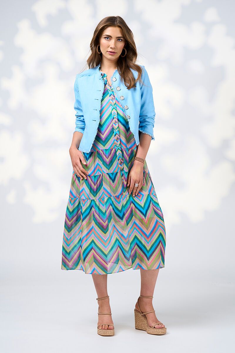 Step into colour with the Wanderlust Midi Dress, a button-through style with an easy tiered skirt that moves beautifully with you. Its playful chevron print feels fresh and fun, while the soft fabrication makes it dreamy to wear day to night.