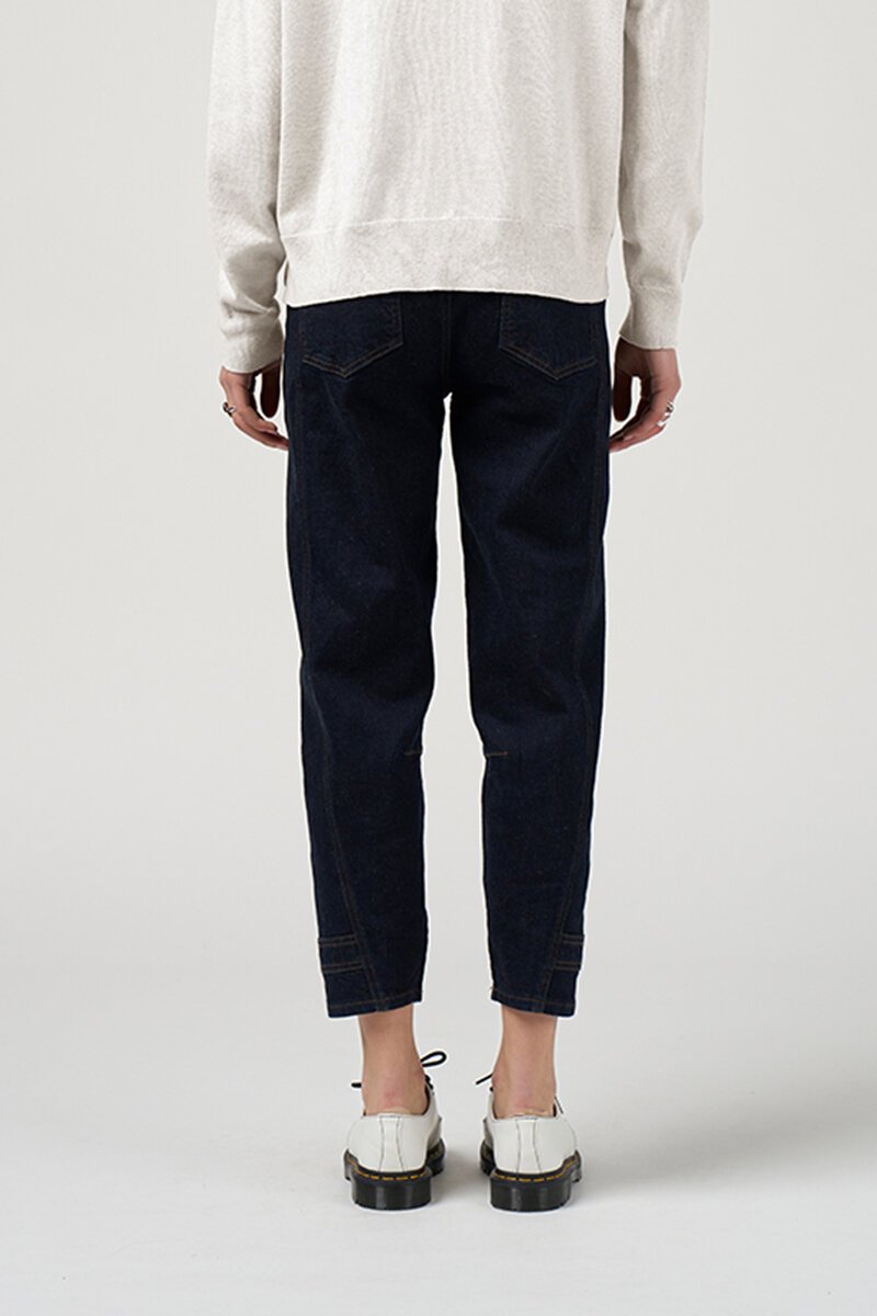 The Madly Sweetly Dusk Jeans are a stretch denim jean with a barrel style leg, featuring angled side seams for a flattering fit, with leg darts and a stitched down tab detail at the hem.